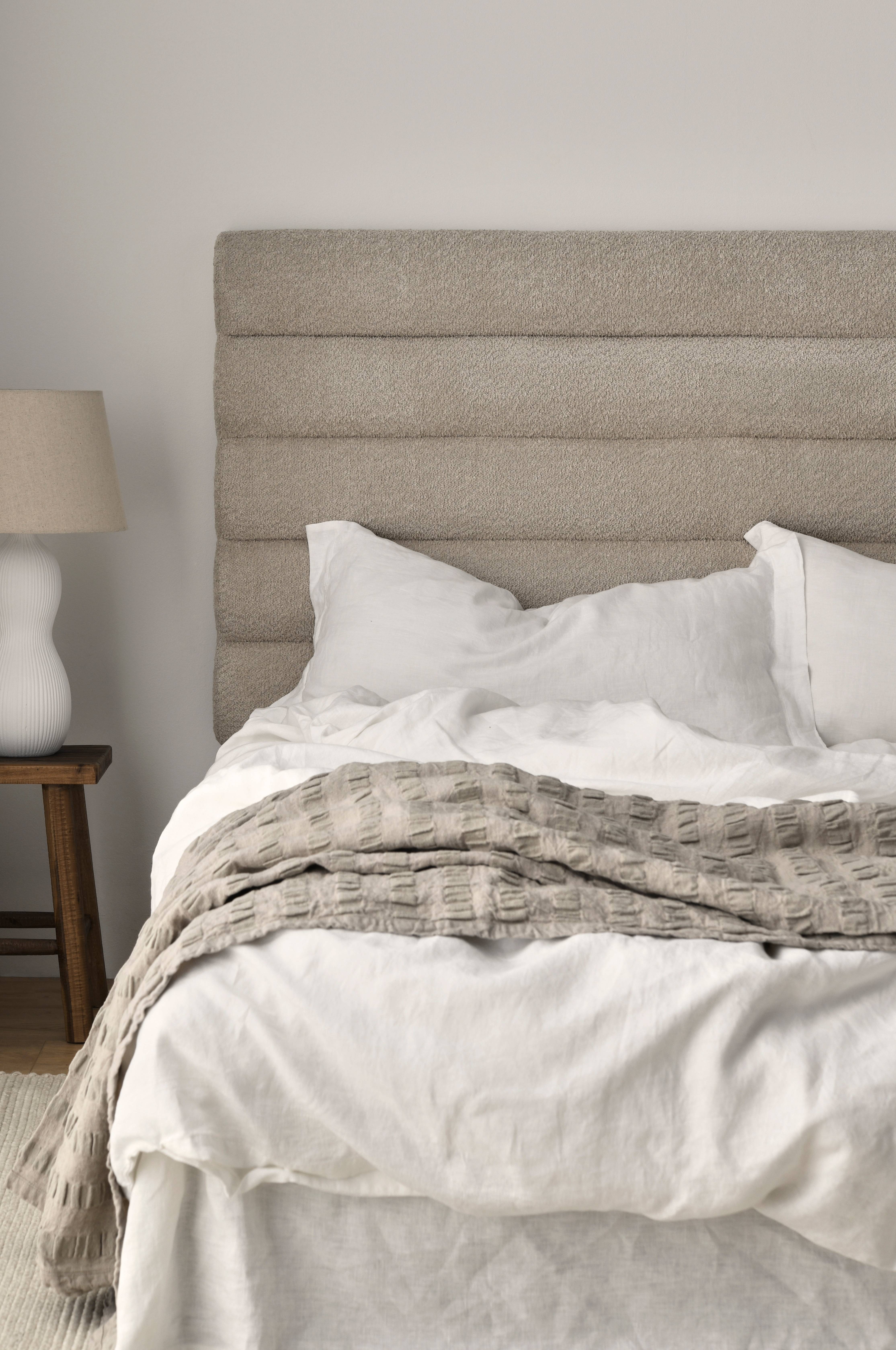 Topattu sängynpääty, jonka runko massiivipuuta ja vaneria. Päällinen polyesteribukleeta, jossa aaltomainen pintakuvio. Täyte polyesterivanua. Ripustetaan seinälle. • Tuote sisältää FSC-sertifioitua puuta, joka on hakattu kestävästi ja vastuullisesti hoidetusta metsästä ja jonka tuotannossa on huomioitu sekä ihmiset että ympäristö.