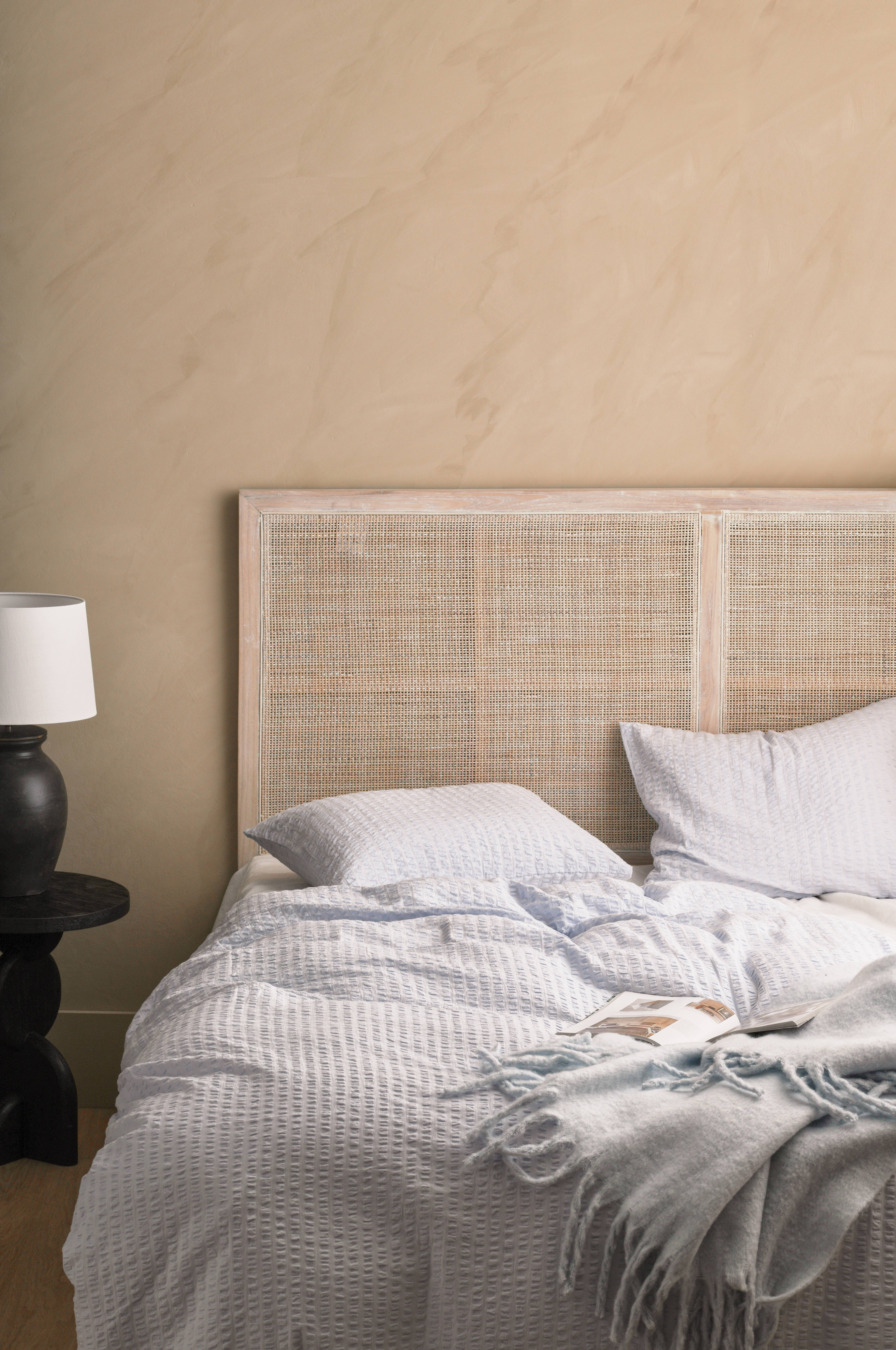 Sängynpääty valkoiseksi kuultomaalattua massiivimäntyä ja rottinkia. Takana kiinnikkeet ripustamista varten.