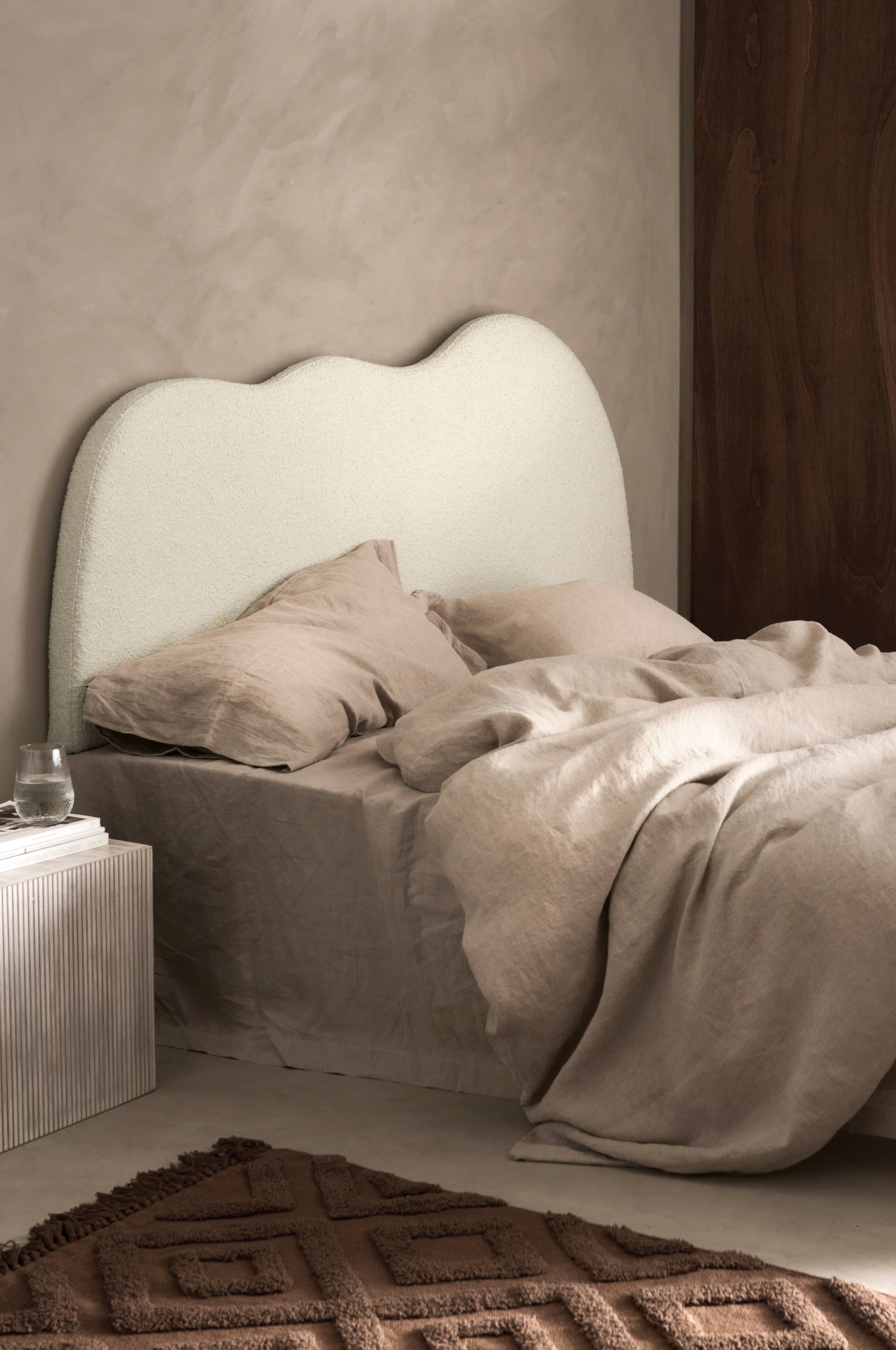Sängynpääty, jossa pehmeä bukleepäällinen. Runko vaneria ja massiivista FSC-sertifioitua puuta. Vaahtomuovitoppaus. Korkeus korkeimmasta kohdasta 80 cm, matalimmasta 65 cm.