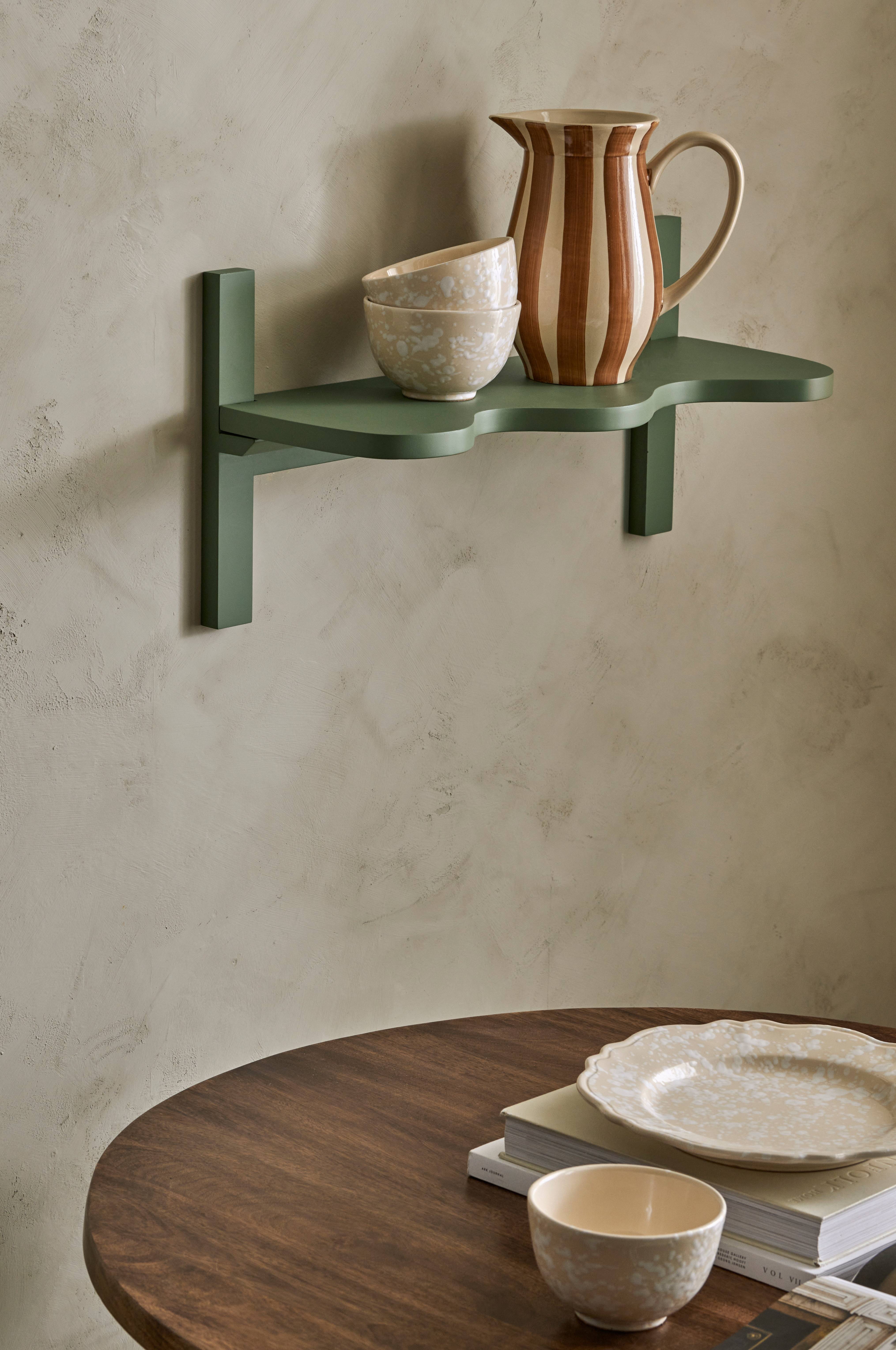 Seinähylly MDF-levyä. Hyllytaso on muodoltaan epäsäännöllinen.