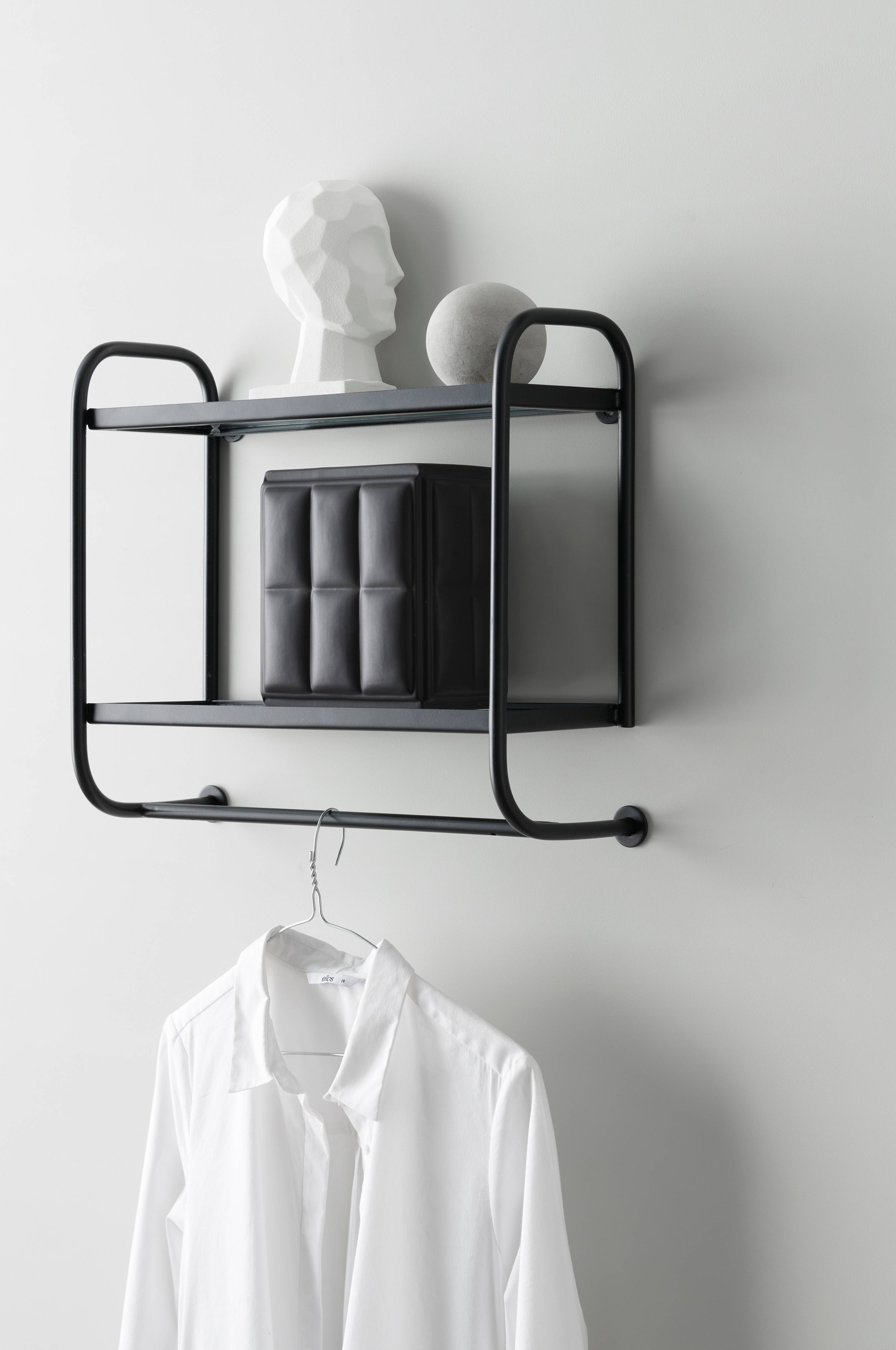 Seinään kiinnitettävä hyllykkö. Sopii niin eteiseen, keittiöön kuin kylpyhuoneeseenkin. Messinginväristä metallia. Kaksi lasista hyllytasoa ja alapuolella tanko pyyhkeille (koukku ei mukana), kaulaliinoille, vöille jne. Korkeus 42 cm. Syvyys 16 cm. Leveys 43 cm. Toimitetaan koottuna.