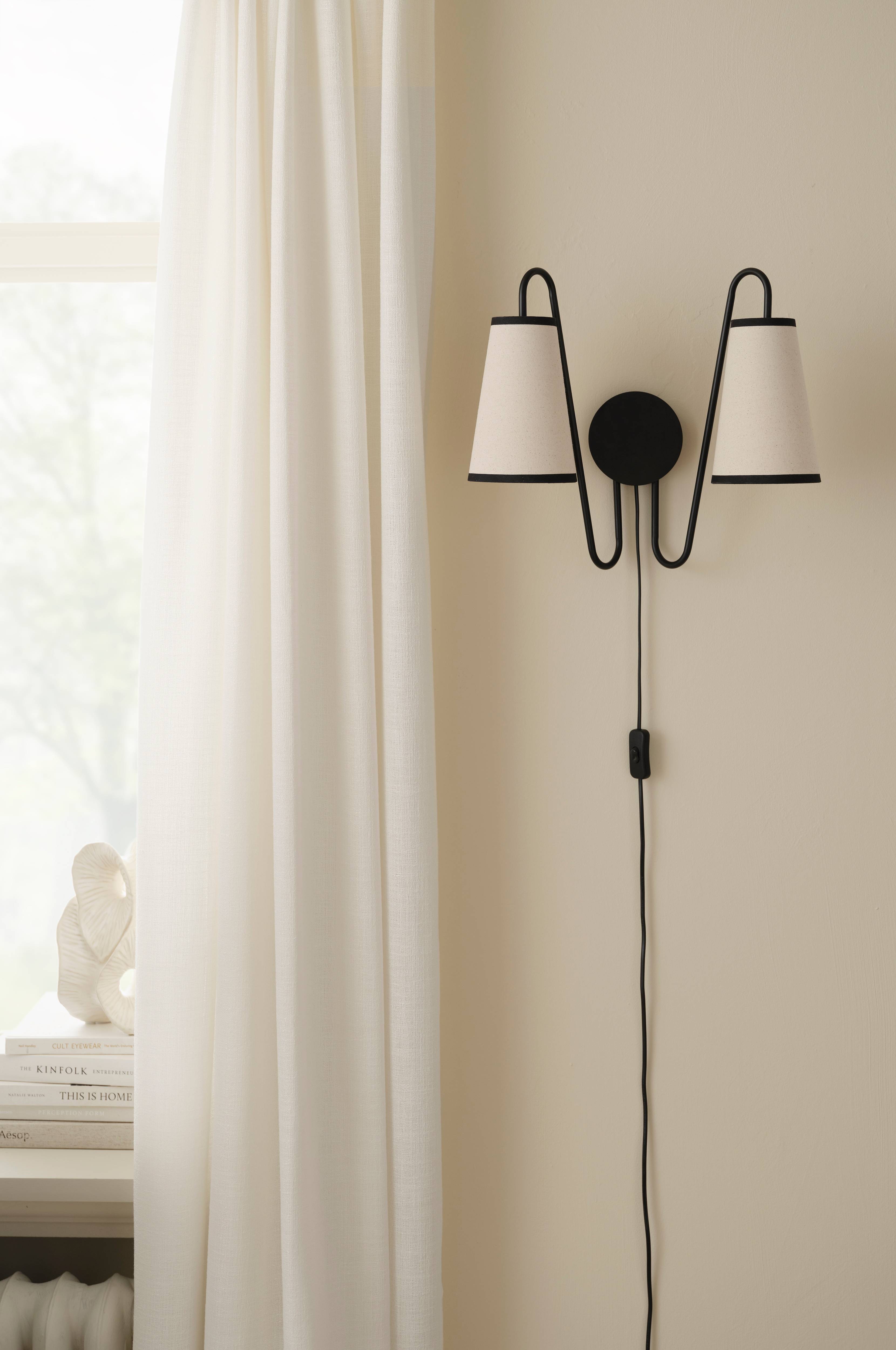 • Seinävalaisin metallirungolla ja kahdella lampunvarjostimella pellavakankaasta• Muovinen johto kytkimellä• Kaksi valonlähdettä• Valonlähde ei sisälly toimitukseen