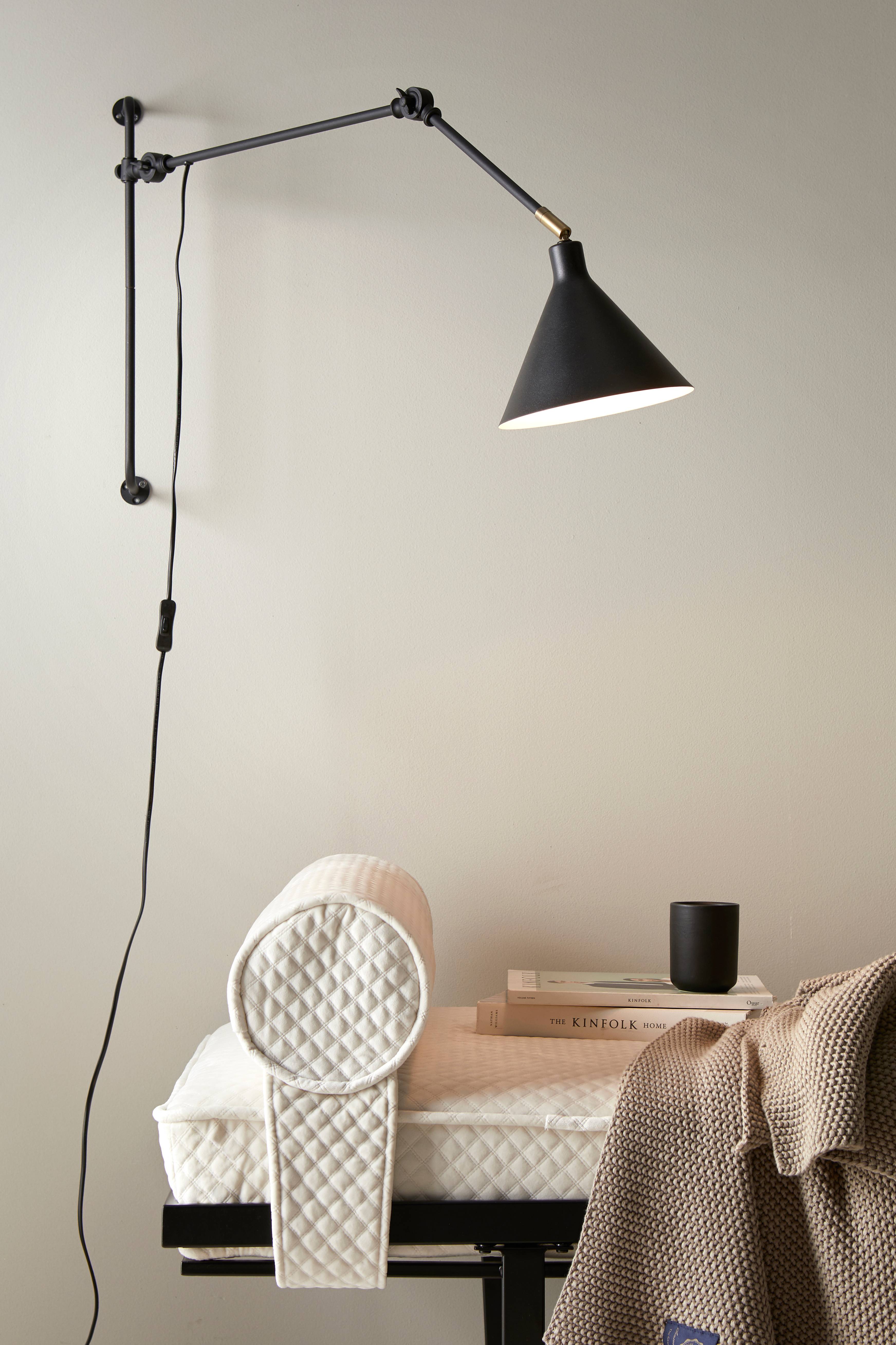 Seinävalaisin jauhemaalattua metallia. Valaisin on kiinnitetty seinäkiinnikkeeseen, jonka korkeus on 50 cm. Kaksi korkeussuunnassa säädettävää vartta. Varjostimessa on valkoinen sisäpinta ja sitä voi säätää korkeus- ja sivusuunnassa. Koko valaisinta voidaan säätää seinäkiinnikkeessä korkeus- ja sivusuunnassa. Varsien pituudet 40 ja 20 cm. Varjostimen mitat: korkeus 17 cm, Ø 20 cm. Muovijohto, jossa virtakytkin. Johdon pituus 2 m. Iso lampunkanta E27. Enintään 25 W. Valonlähde ei sisälly toimitukseen.
