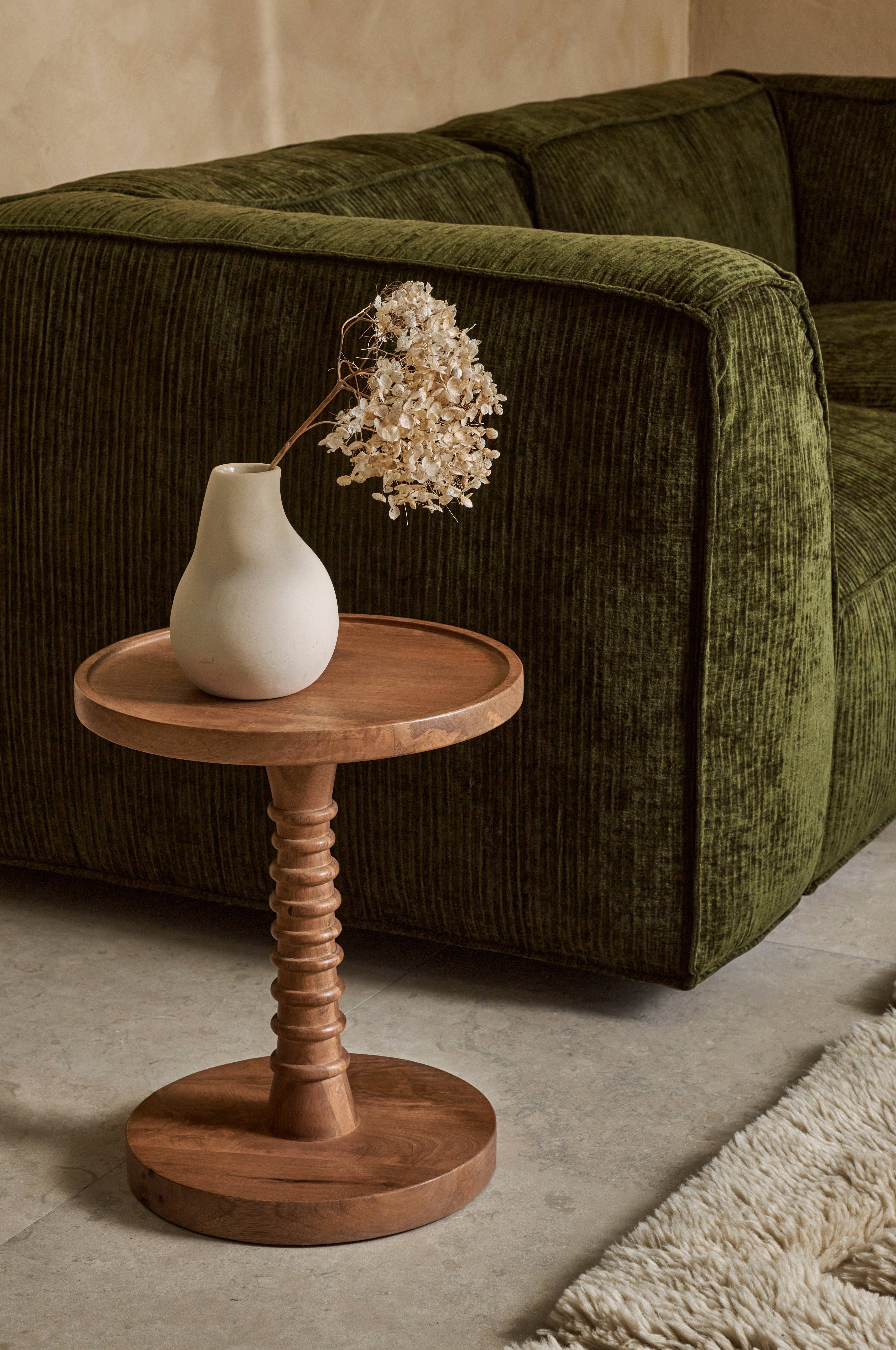 Sivupöytä petsattua mangopuuta. Sorvattu jalka.