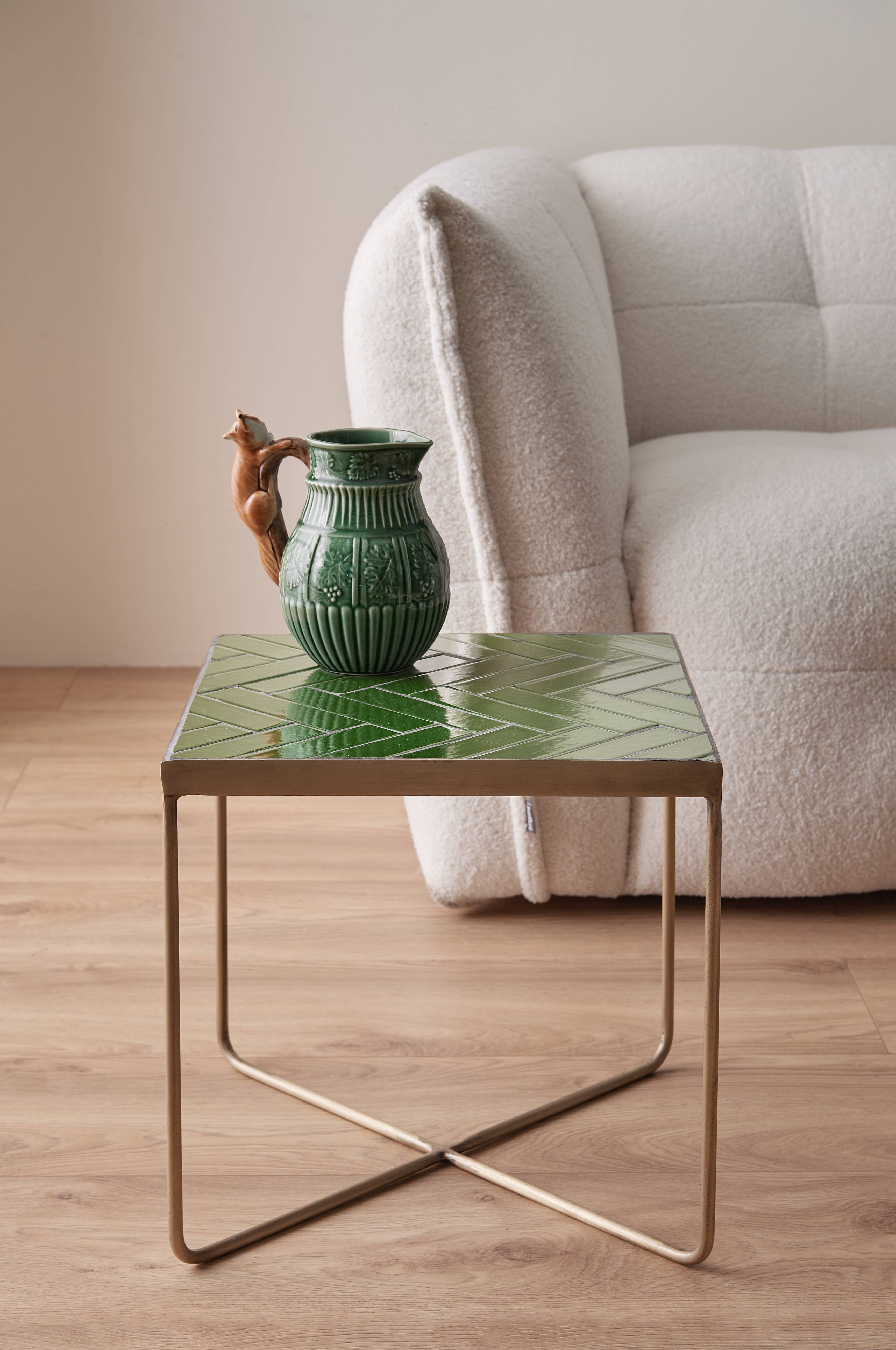 Sivupöytä, jossa runko kullanväristä metallia. Pöytälevy on valmistettu keraamisista laatoista.