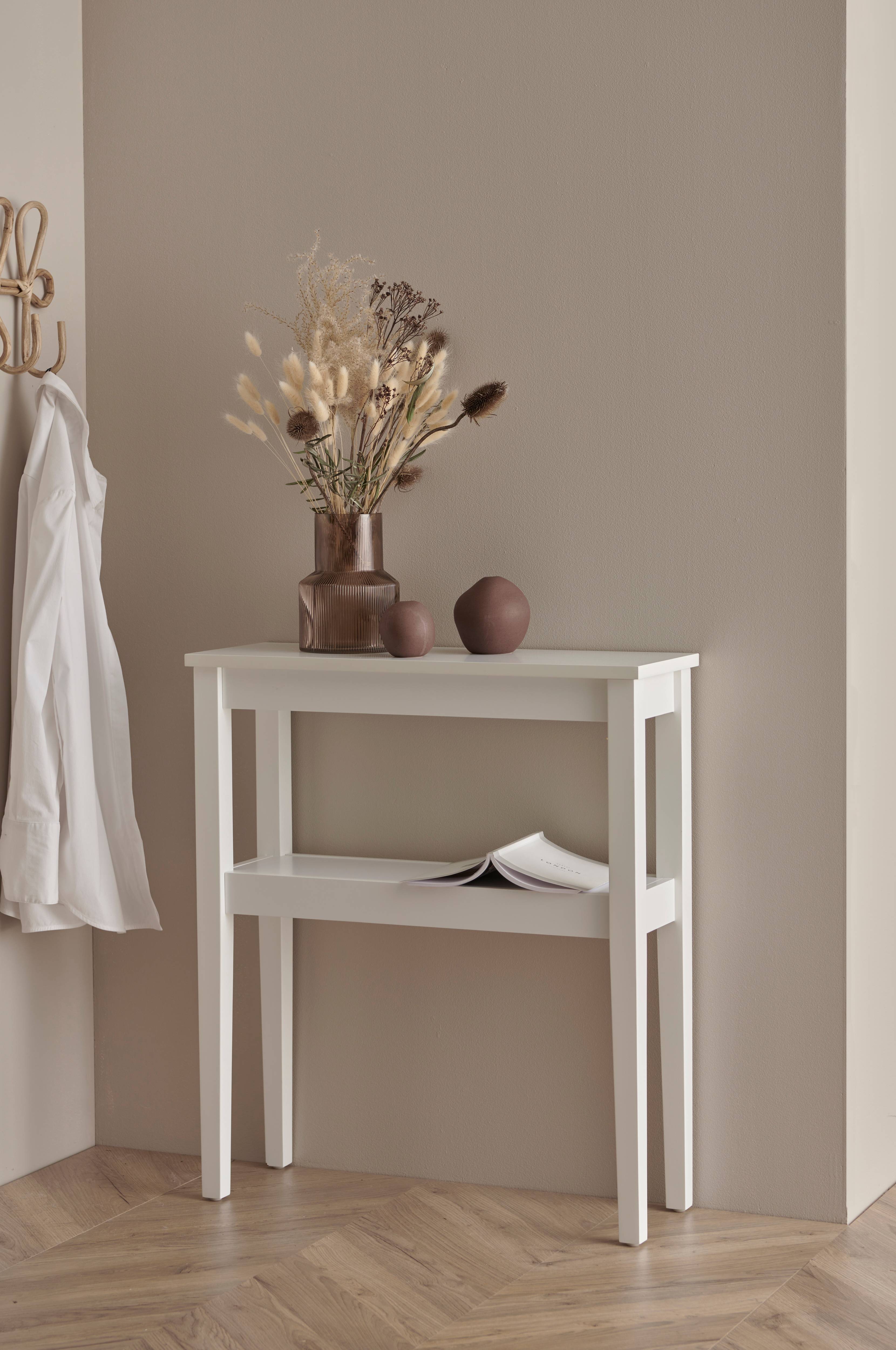 Ruiskumaalattua mäntyä ja MDF-levyä. Kaksi hyllytasoa. Korkeus 80 cm. Leveys 70 cm. Syvyys 25 cm. Etäisyys lattiasta ensimmäiseen hyllyyn 42,5 cm. Etäisyys ensimmäisestä hyllystä toiseen hyllyyn 24 cm. Toimitetaan osina.