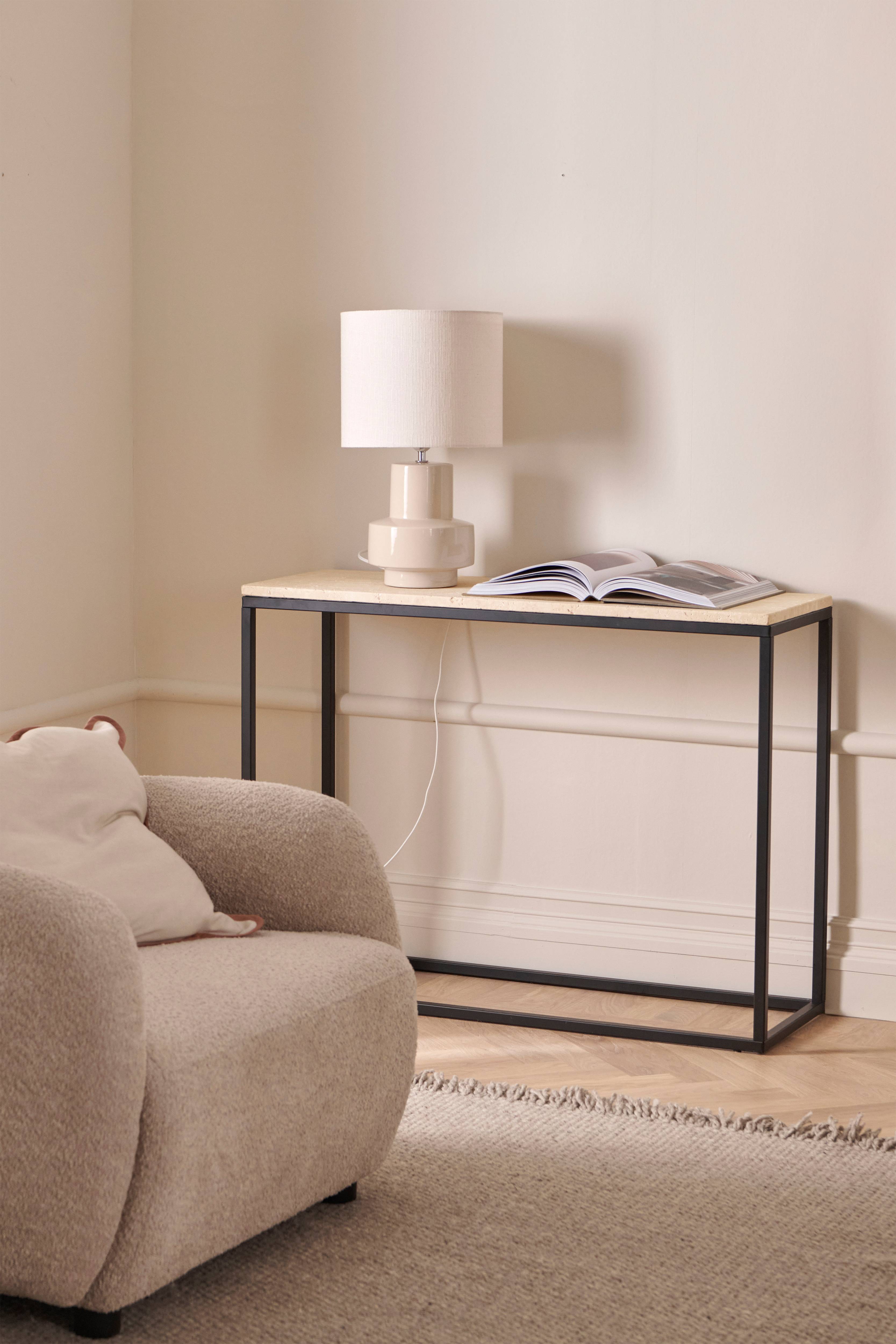 Sivupöytä, jonka jalusta jauhemaalattua metallia ja pöytälevy Travertinia, luonnonkiveä, jossa on luonnollisia värivaihteluita, yksilöllistä patinaa ja elävä pinta. Toimitetaan koottuna.