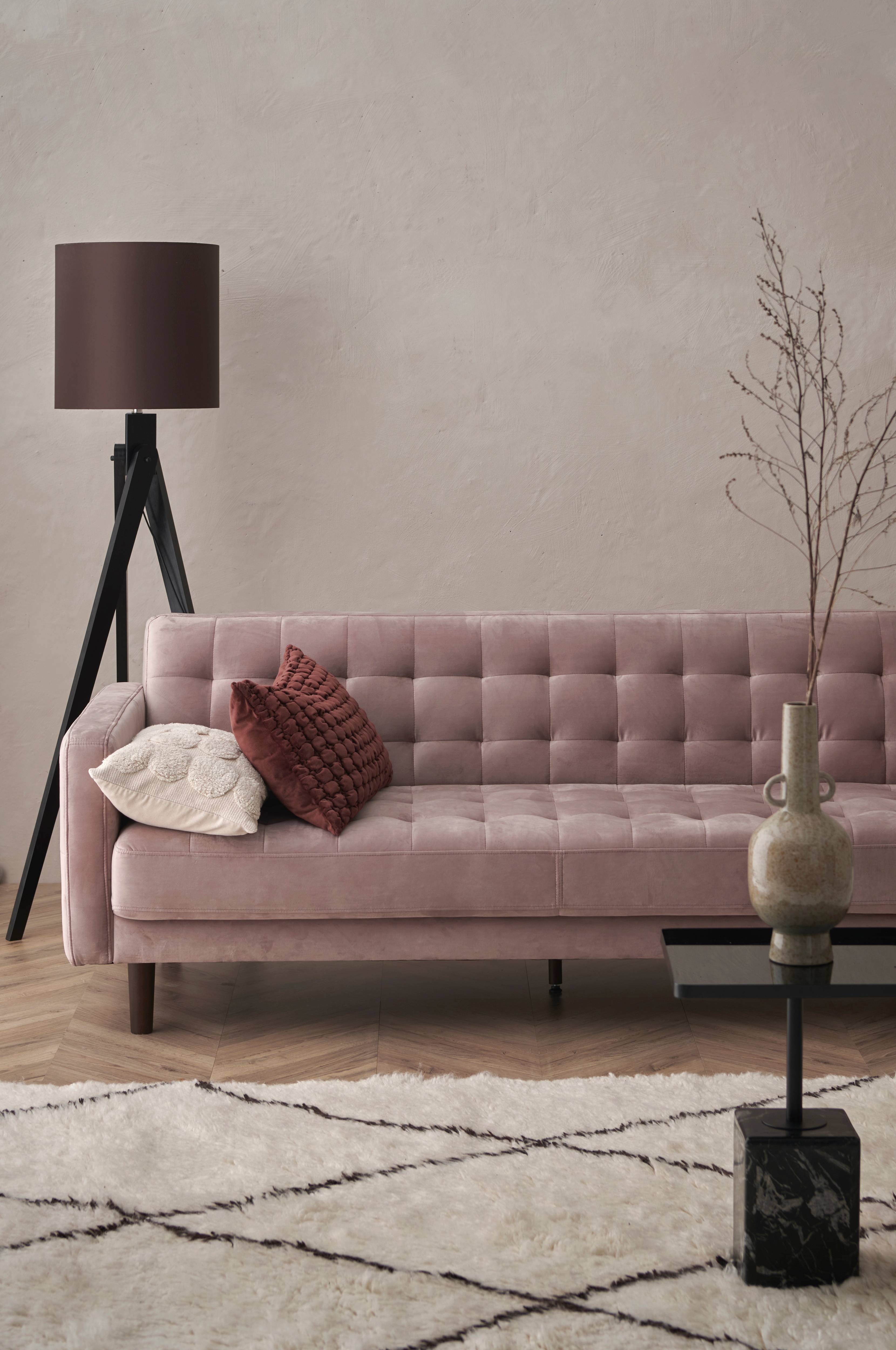 3:n istuttava sohva, jossa klassinen design. Kiinteät istuin- ja selkätyynyt. Runko massiivimäntyä ja metallijalat. Täyte vaahtomuovia. Nozag-jousitus. Päällinen polyesterisamettia. Koristeelliset, syvään upotetut ompeleet selkänojassa ja istuimessa. Martindale-arvo > 25000. Päällistä ei voi irrottaa. Tila huonekalun alla 17 cm. Toimitetaan koottuna.