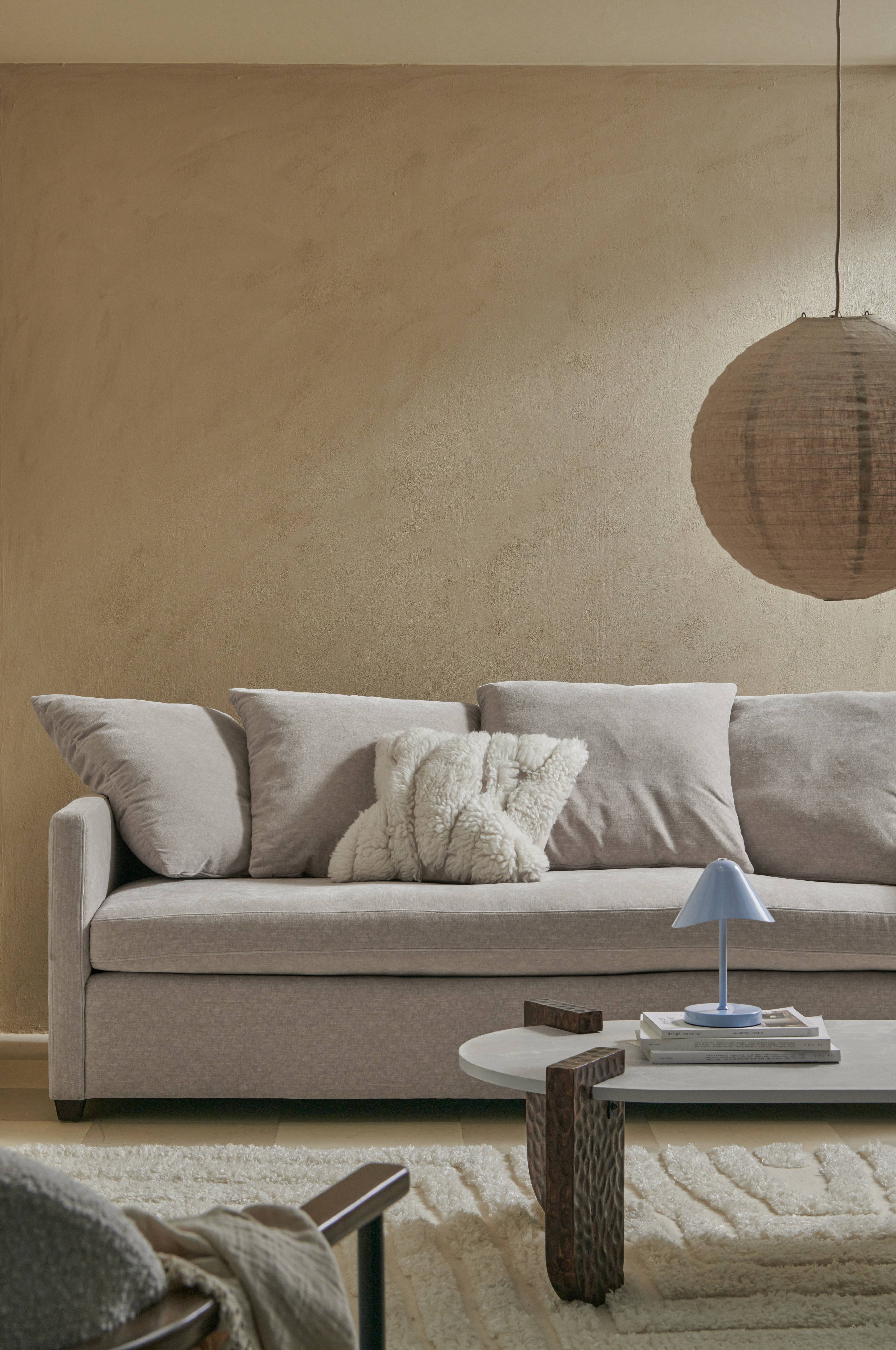 3:n istuttava sohva, jonka päällinen pestyä polyesterisamettia. 4 isoa selkätyynyä, 2 pientä irrallista tyynyä ja yksi yhtenäinen istuinpehmuste. Kaikissa tyynyissä on irrotettava kangas.