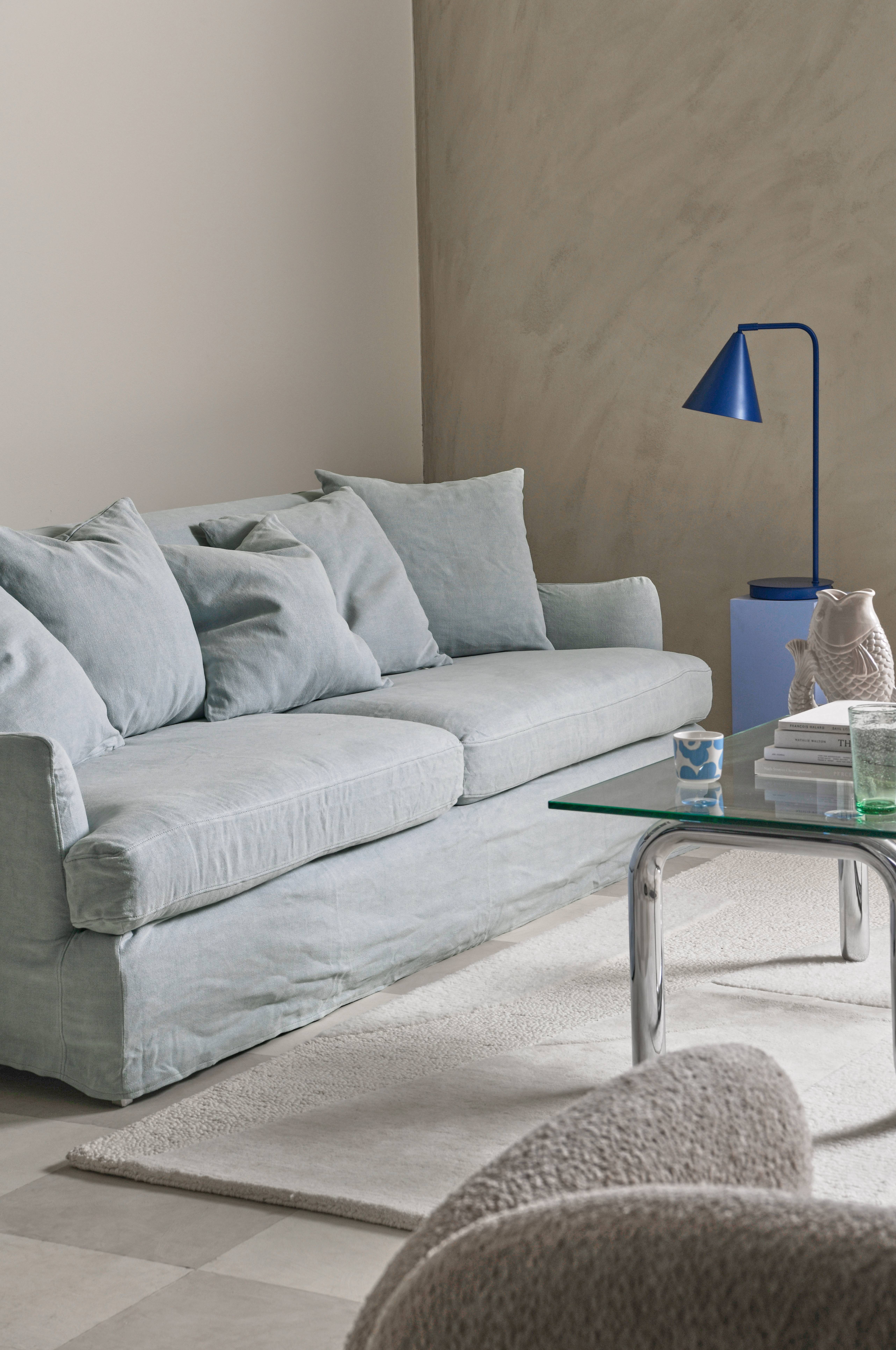 Romanttinen sohva, jossa pyöristetyt muodot ja 5 selkätyynyä. Päällinen 100% pellavaa. Päällinen on irrotettava ja kestää vesipesun 40 asteessa. Runko vaneria ja massiivimäntyä. Istuinpehmusteiden ja tyynyjen täyte polyuretaanivaahtoa ja kuitua. Metallijalat. Mitat: Leveys 210 cm, korkeus 77 cm, syvyys 86 cm. Istuinkorkeus 43 cm, istuinleveys 177 cm, istuinsyvyys 60 cm. Jalkojen korkeus 11 cm.