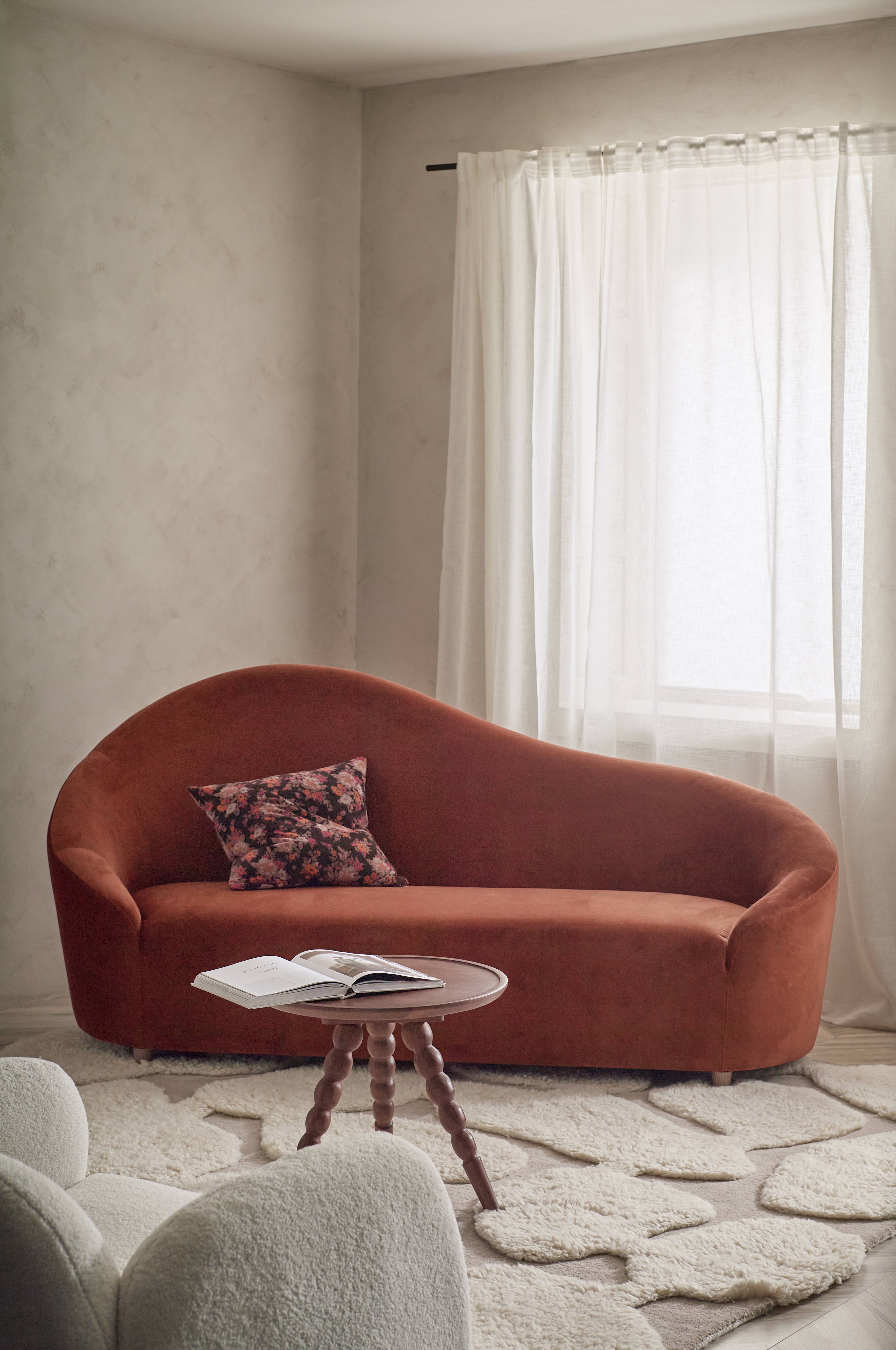 Sohva, jossa samettipäällinen. Pehmeälinjaisessa selkänojassa on orgaaninen muoto.