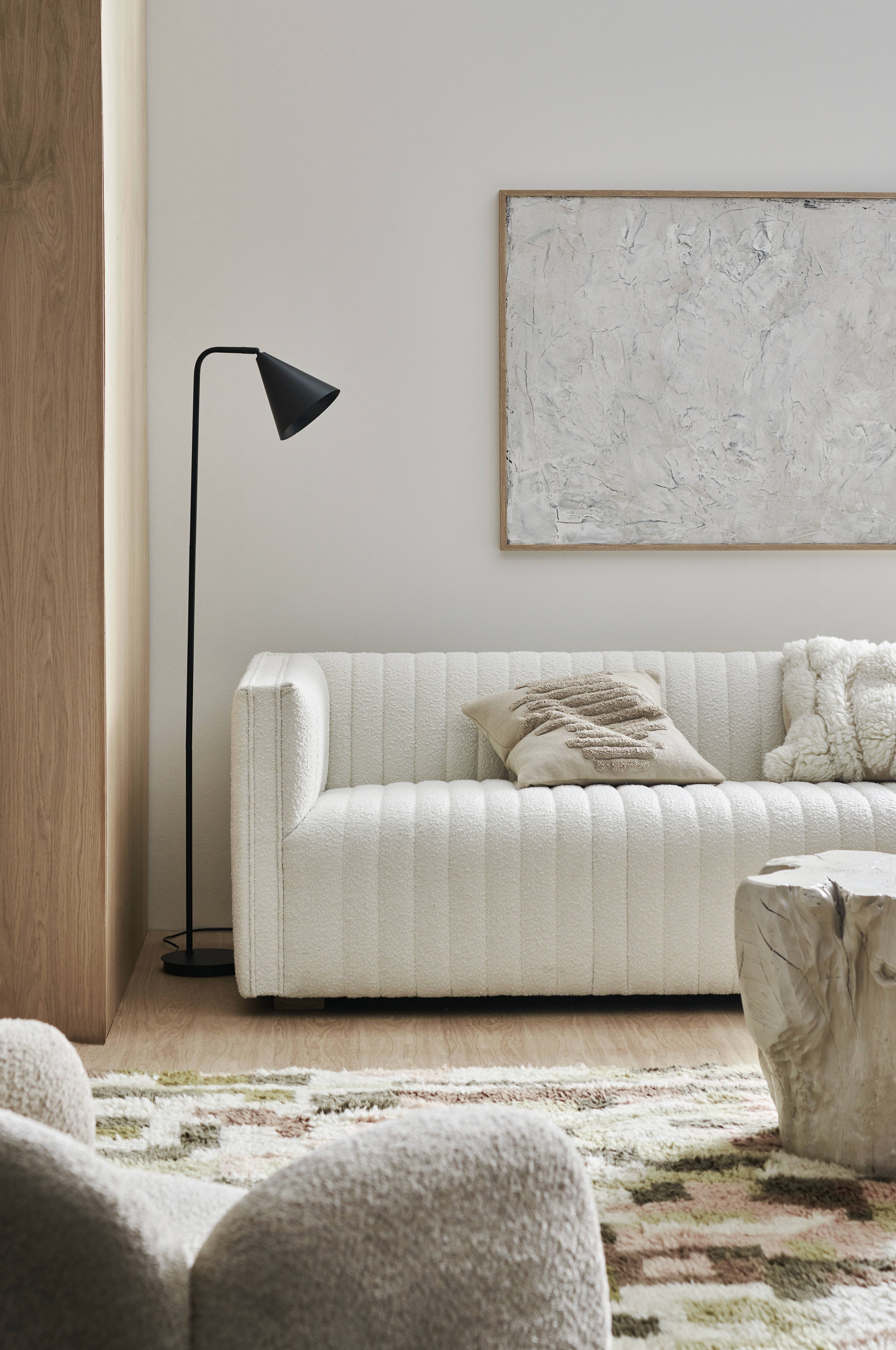 4:n istuttava suora sohva samettia, jossa raidallinen pintakuvio. Päällinen: Polyesteribukleeta, käsinojissa kaksinkertaiset terenauhareunat.