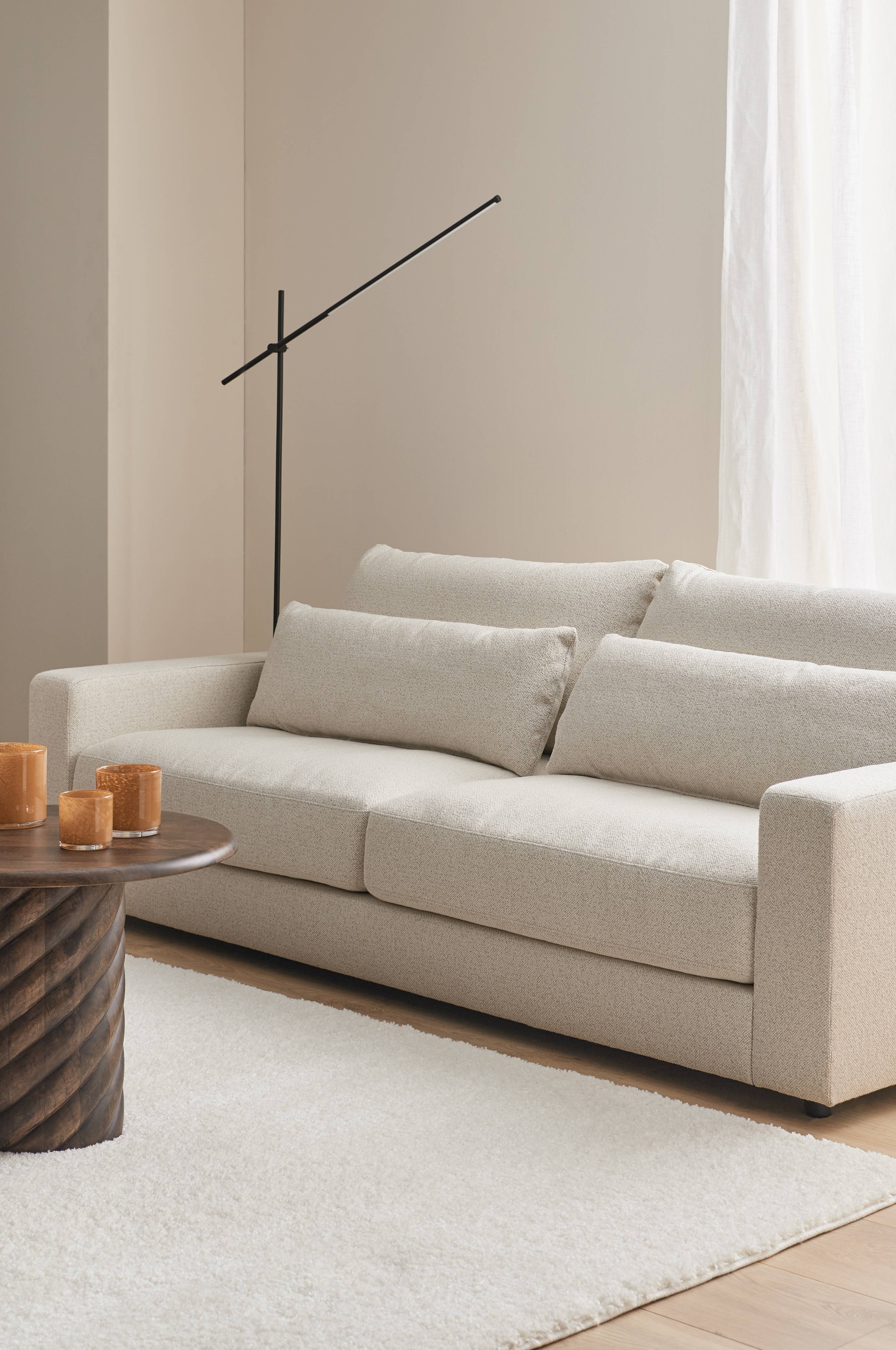 3:n istuttava sohva, jossa bukleeverhoilu. Mukana kaksi irtotyynyä. Selkä- ja istuinpehmusteissa on irrotettava päällinen. Irtotyynyjen päällistä ei voi irrottaa.