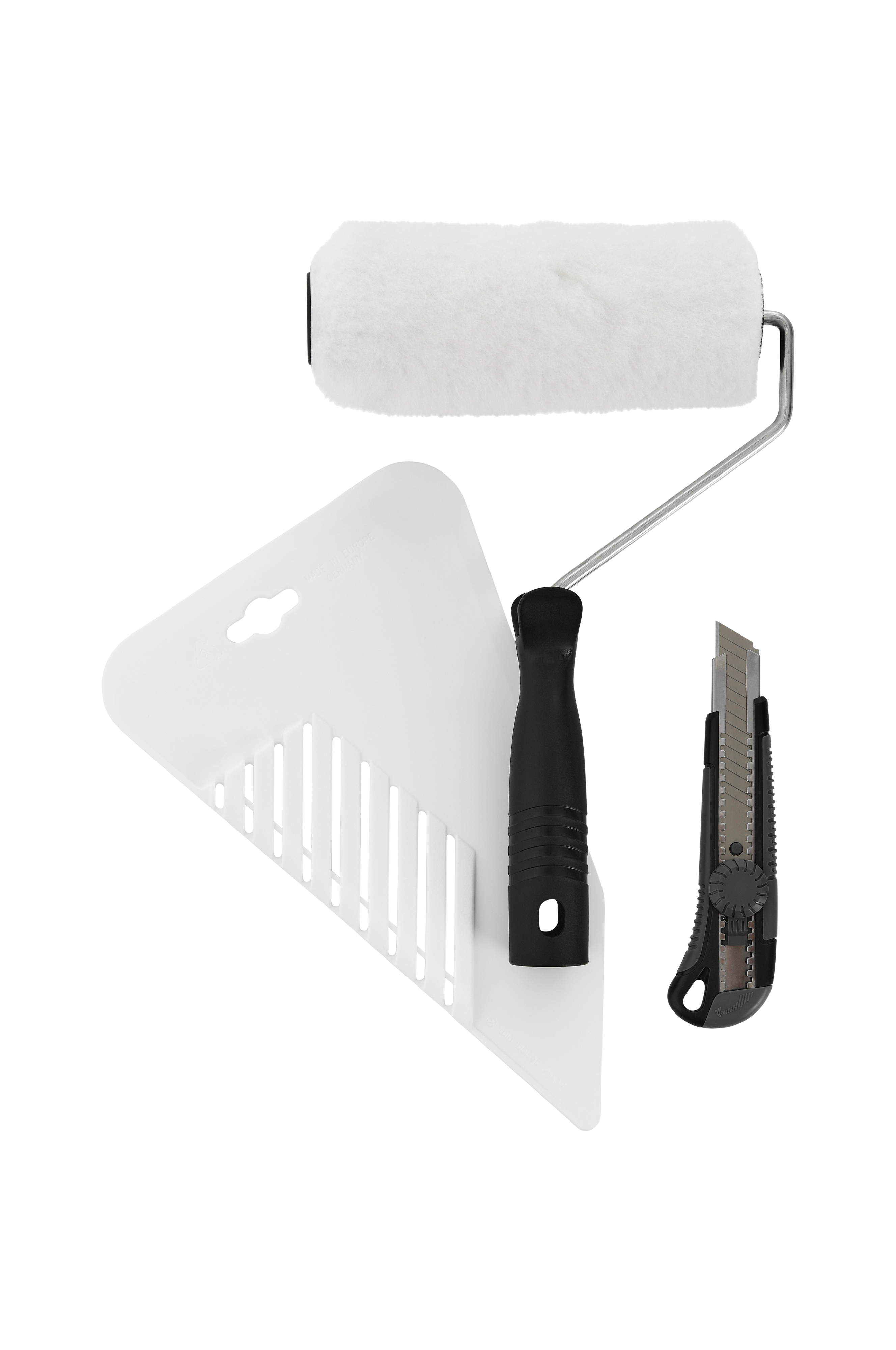 Tapetointisarja, jossa tela, telan varsi, veitsi ja pehmeä tapettilasta. Sarja sopii hyvin myös lasikuitukankaalle ja huovalle.