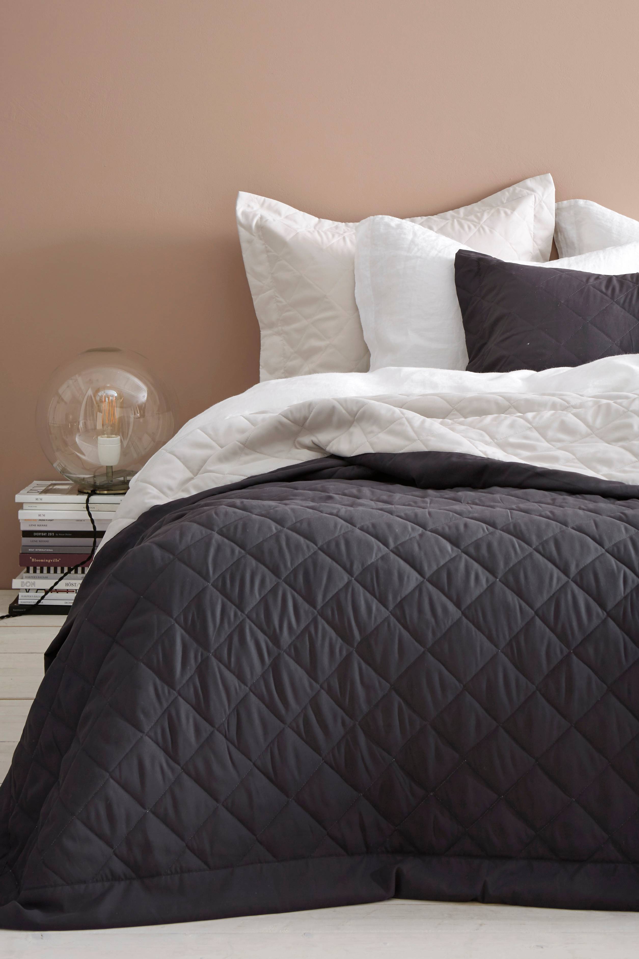 Viistosti tikattu päiväpeite, jossa kehys ympärillä. Kaksipuolinen/käännettävä. Eriväriset, sointuvan sävyiset puolet. Päällinen ja toppaus polyesteriä.