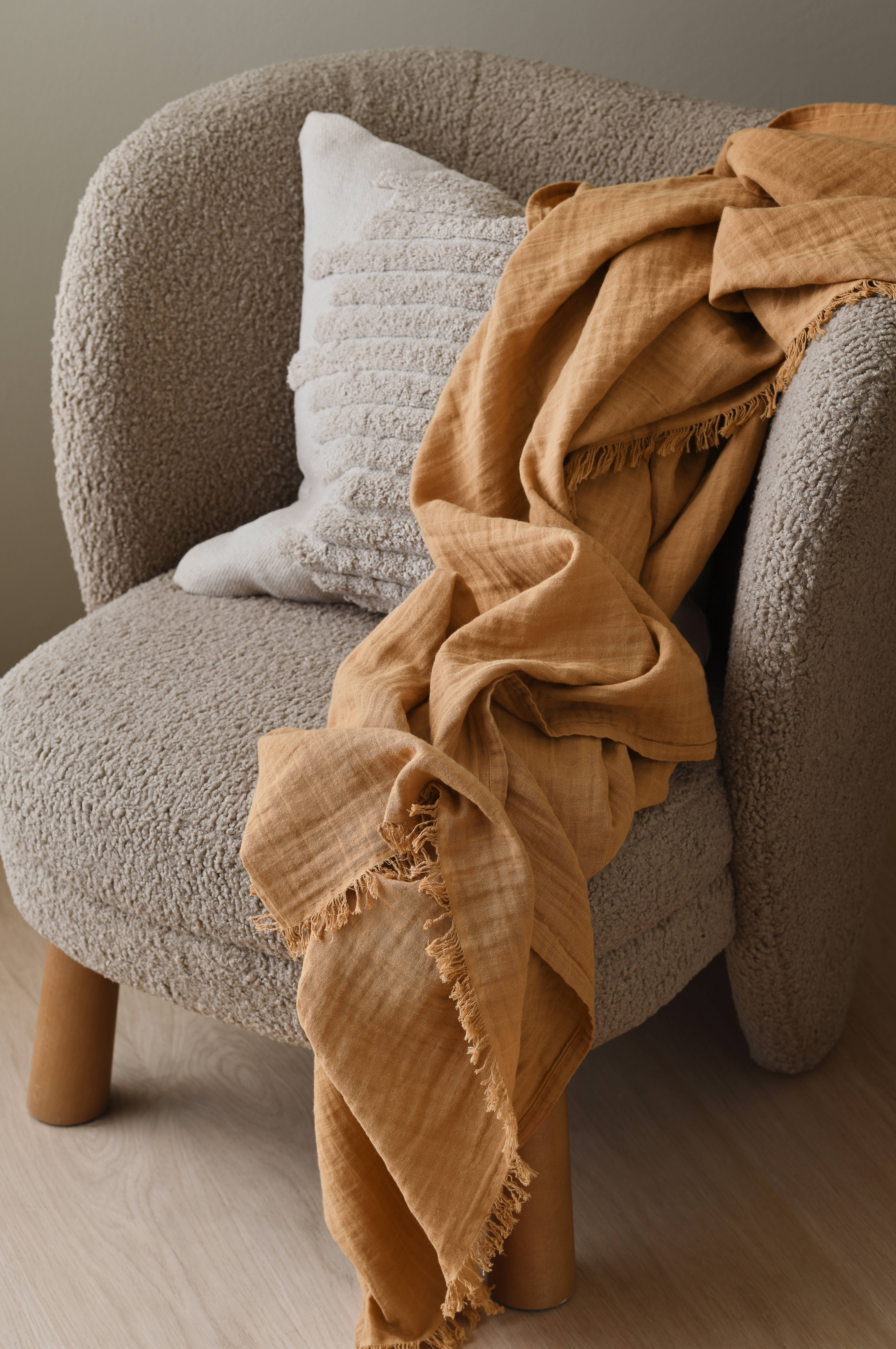 Torkkupeitto kaksikerroksista pestyä puuvillamusliinia. Musliini on erittäin pehmeää ja ilmavaa kangasta, jossa on hillitty raidallinen struktuuripinta. Hapsut lyhyillä sivuilla.