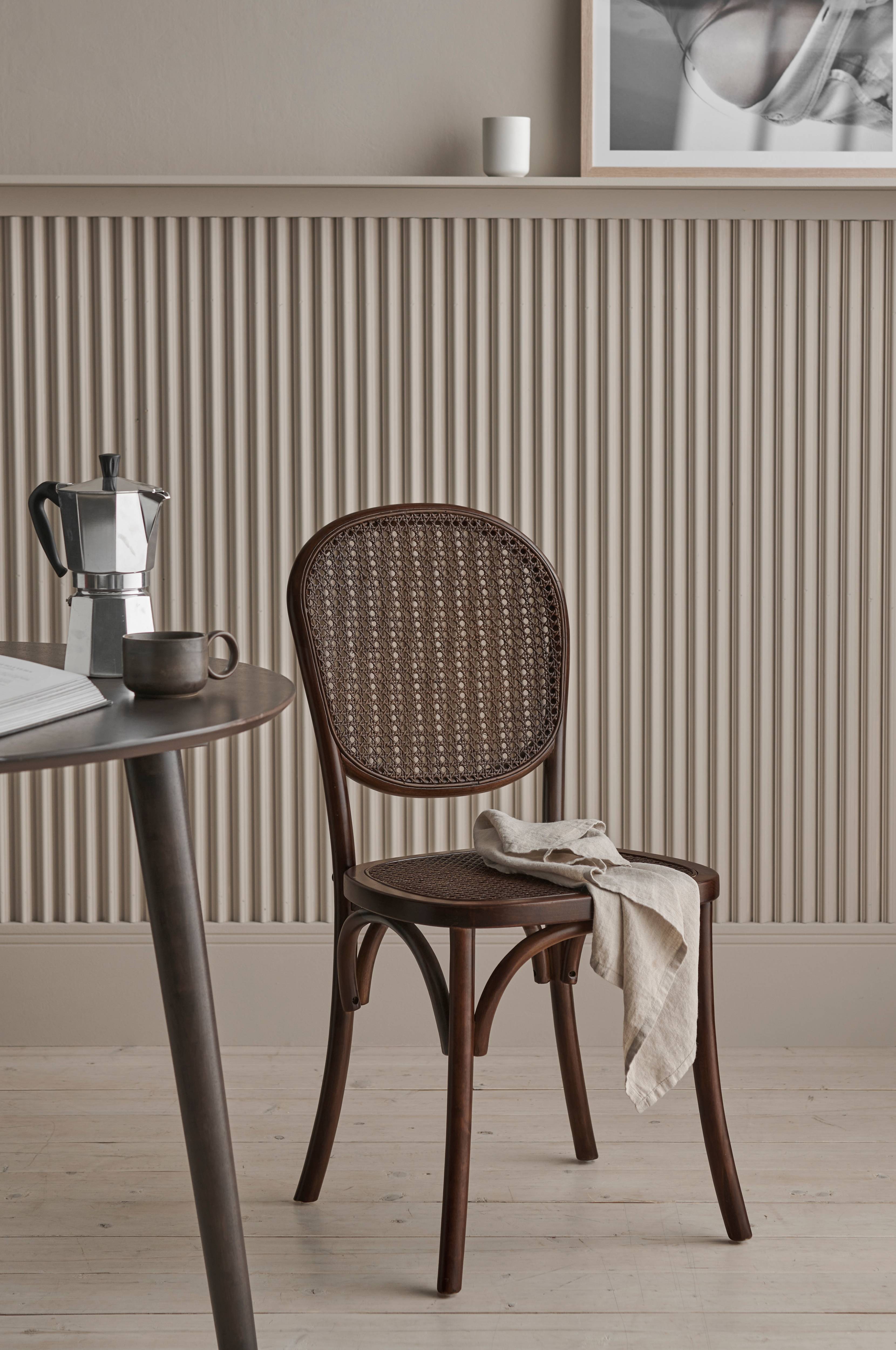 Runko koivua, selkänoja ja vahvistettu istuin rottinkia. Pakkauksessa kaksi tuolia. Korkeus 89 cm, leveys 44,5 cm, syvyys 56 cm. Istuinsyvyys 42 cm, istuinkorkeus 46,5 cm. Toimitetaan koottuna. Paino 10 kg.