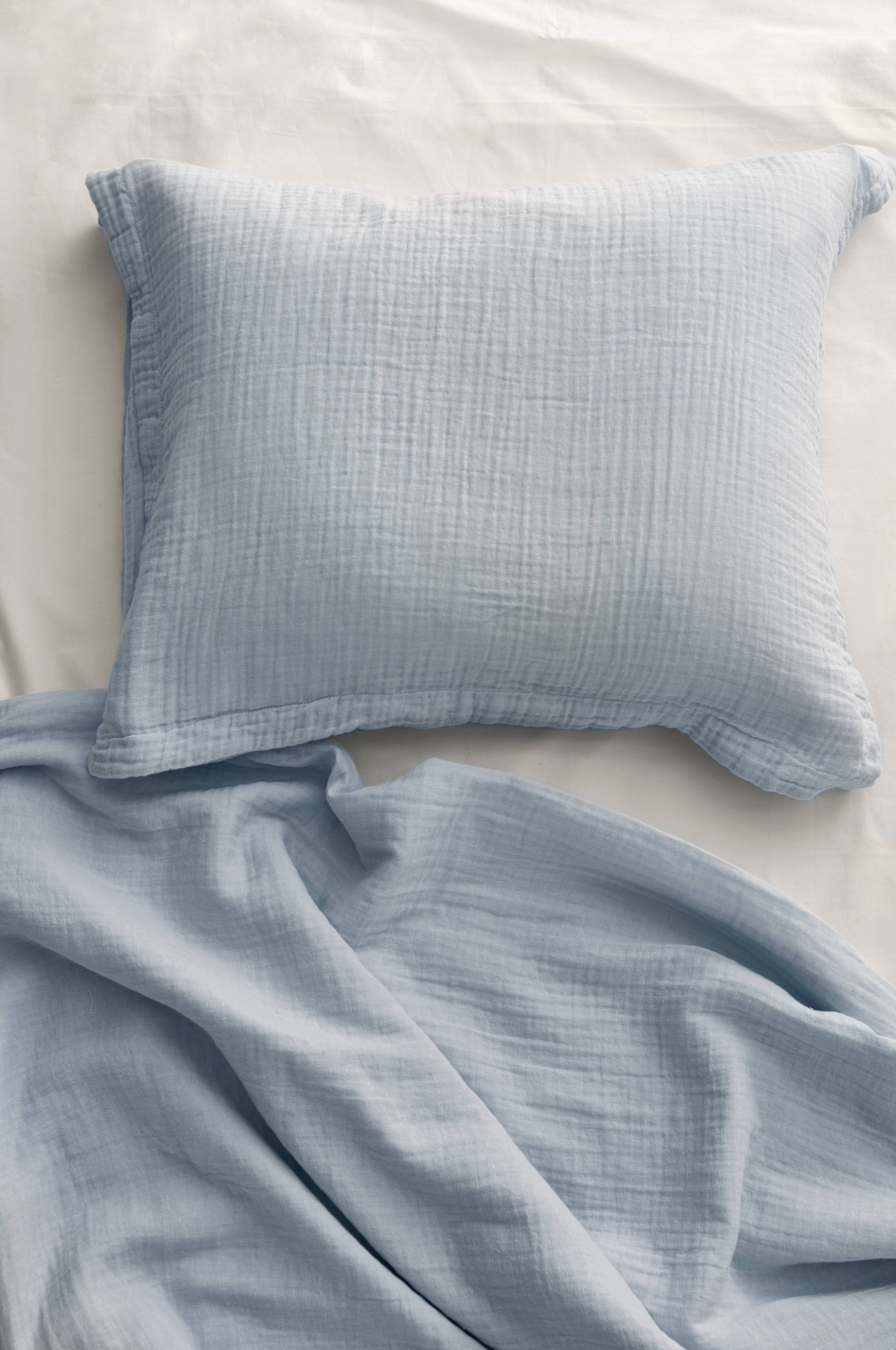 Tyynyliina kaksinkertaista pestyä ekologista puuvillamusliinia. 2,5 cm:n reunus ympäriinsä. Langantiheys: 230 TC.