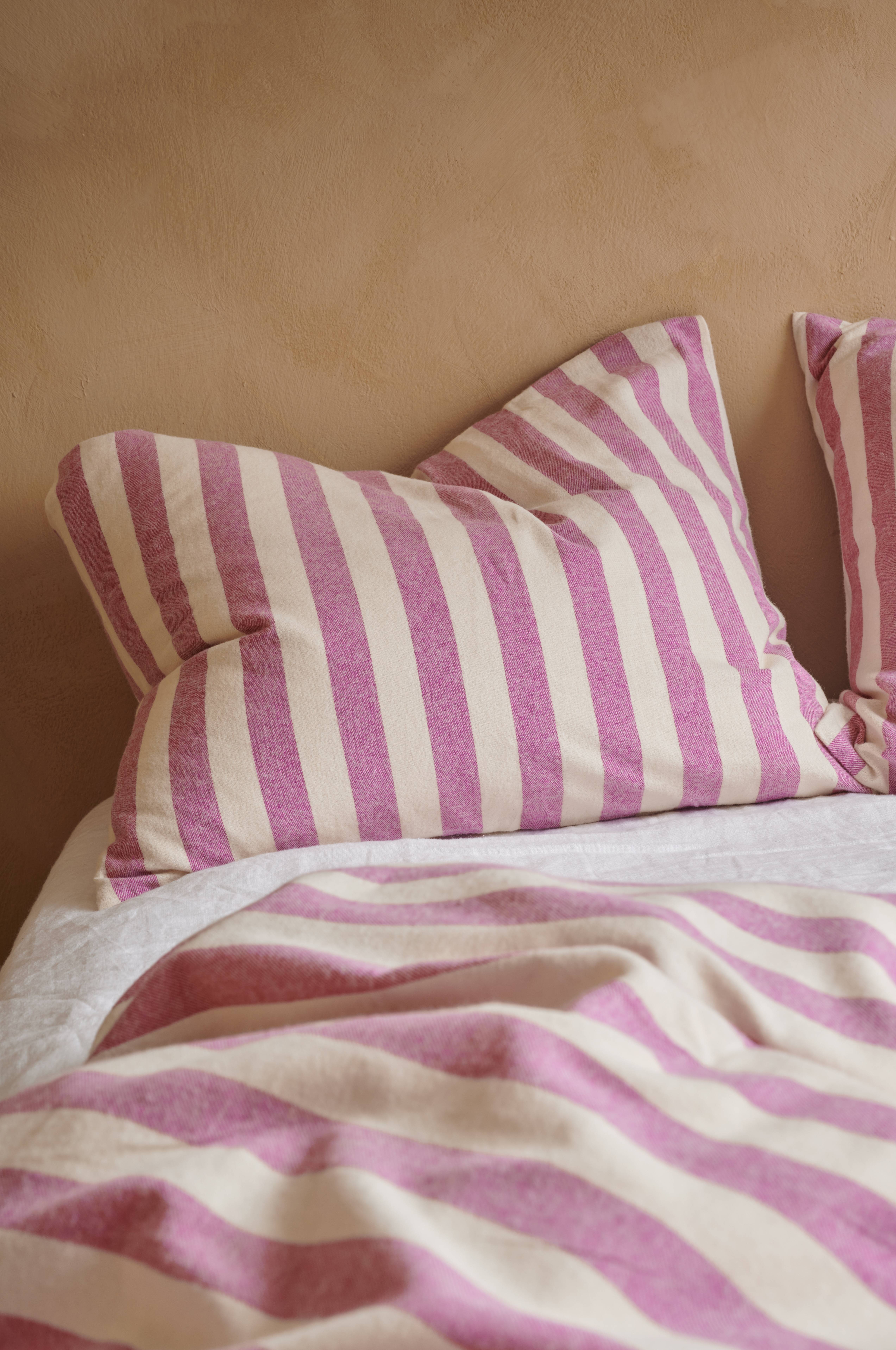 Tyynyliina ekologista puuvillaflanellia, jossa on lankavärjätyt raidat. Pehmeäksi pesty, harjattu pinta ja kaksinkertaiset farkkusaumat. Langantiheys 110 TC. Koko 50x60 cm.