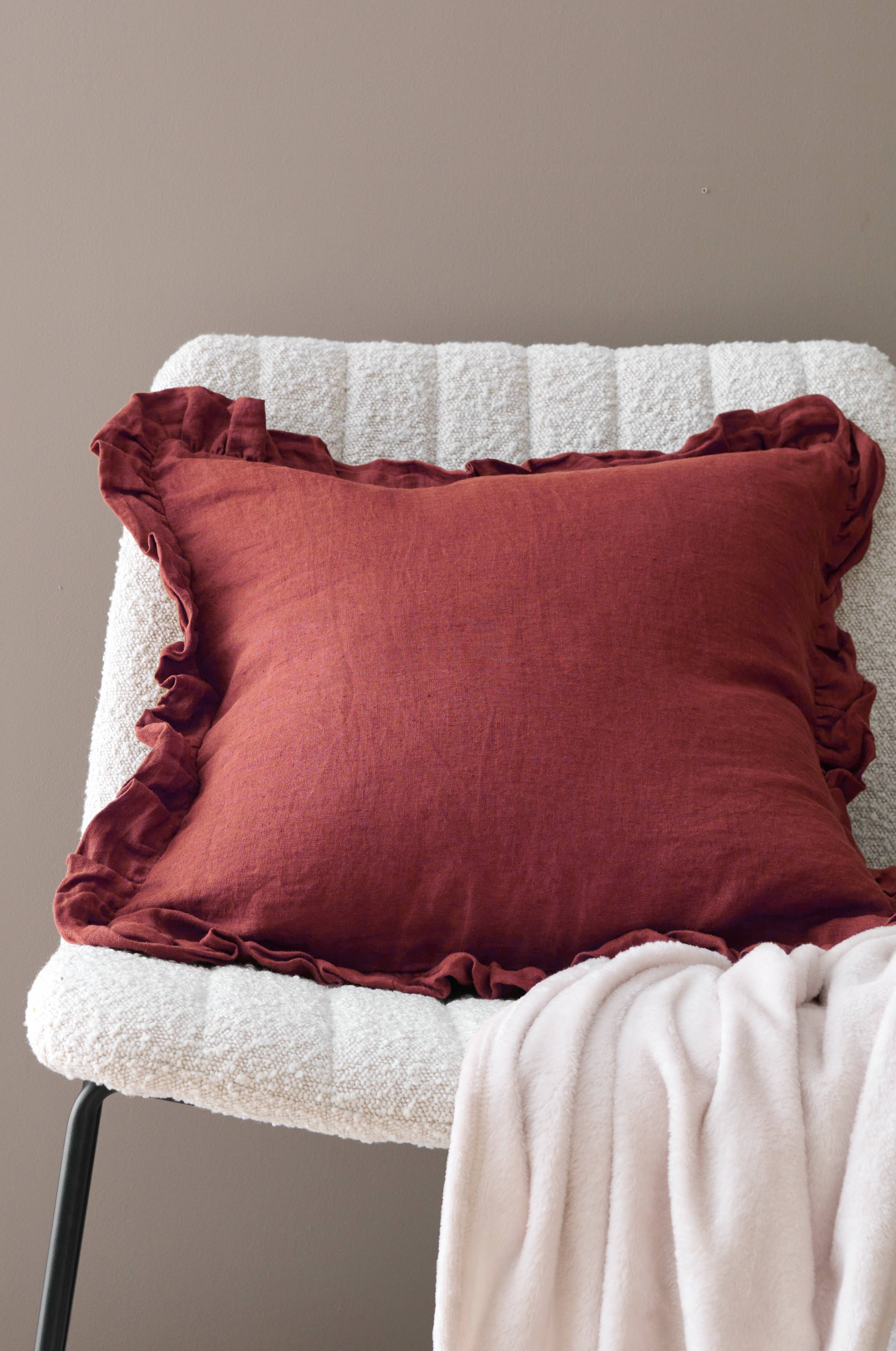 Tyynynpäällinen pehmeää pestyä ranskalaista pellavaa. Röyhelö ympäriinsä ja vetoketju takana. Koko 50x50 cm + röyhelö 4,5 cm.