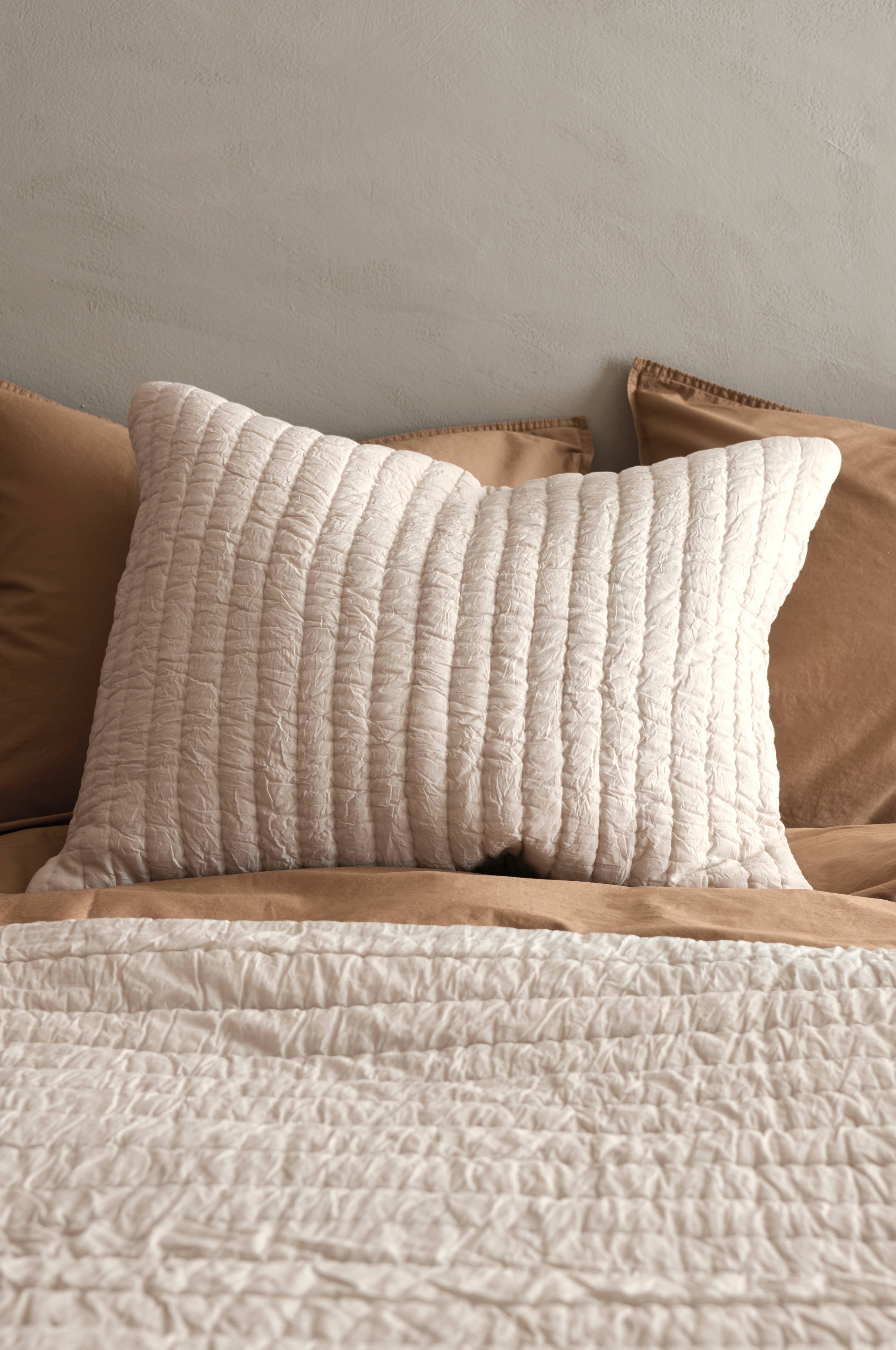 Käsin tikattu tyynynpäällinen pehmeää, pestyä puuvillavoileeta. Reunusnauha ympäriinsä. Täyte 250 g puuvillaa. Vetoketju. Koko 50x60 cm.