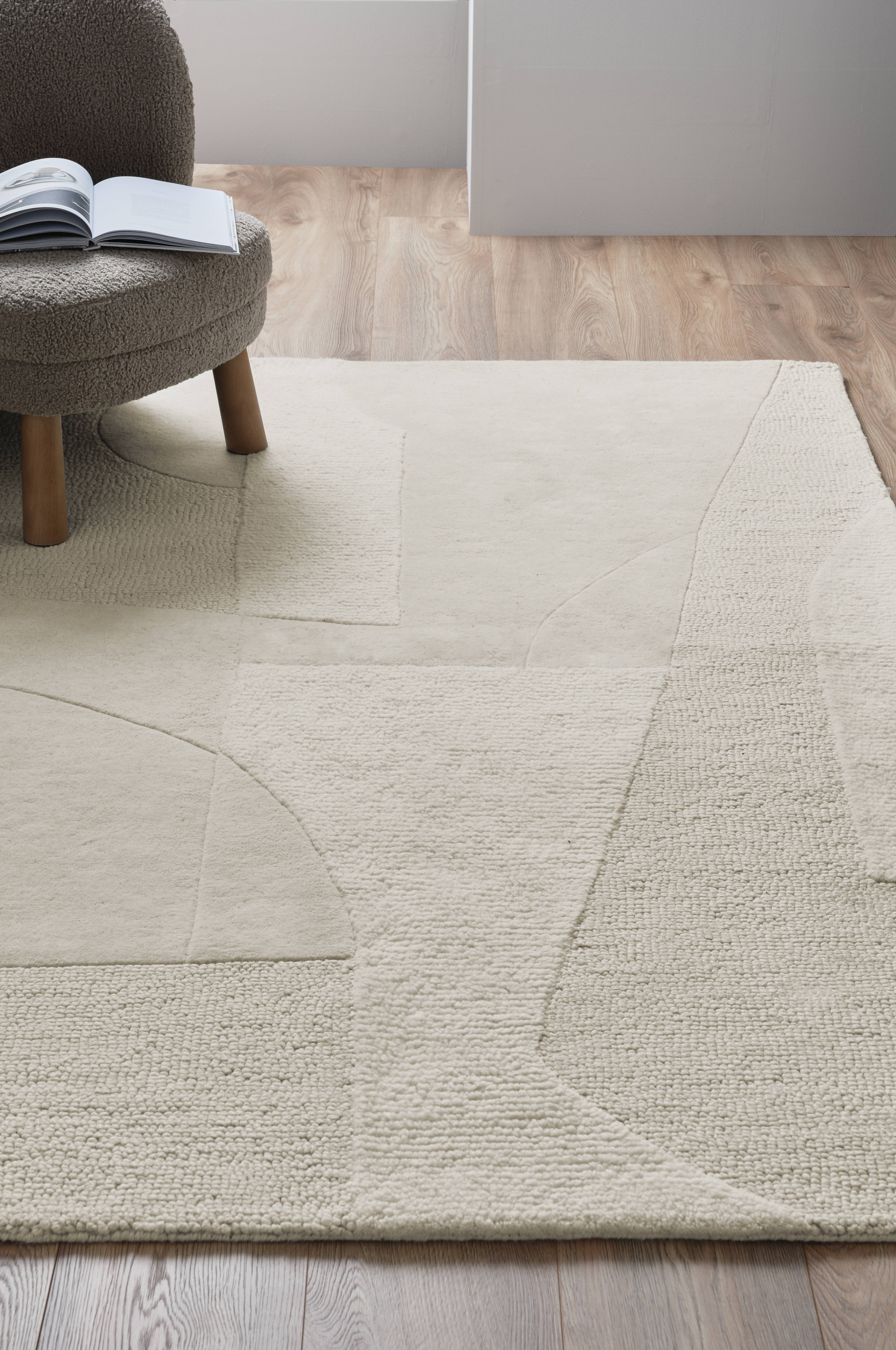 Käsinkudottu ja käsin tuftattu villamatto, jonka erilaiset pintakuviot luovat patchwork-vaikutelman. Alapuoli puuvillaa. Maton paksuus 1,5 cm.