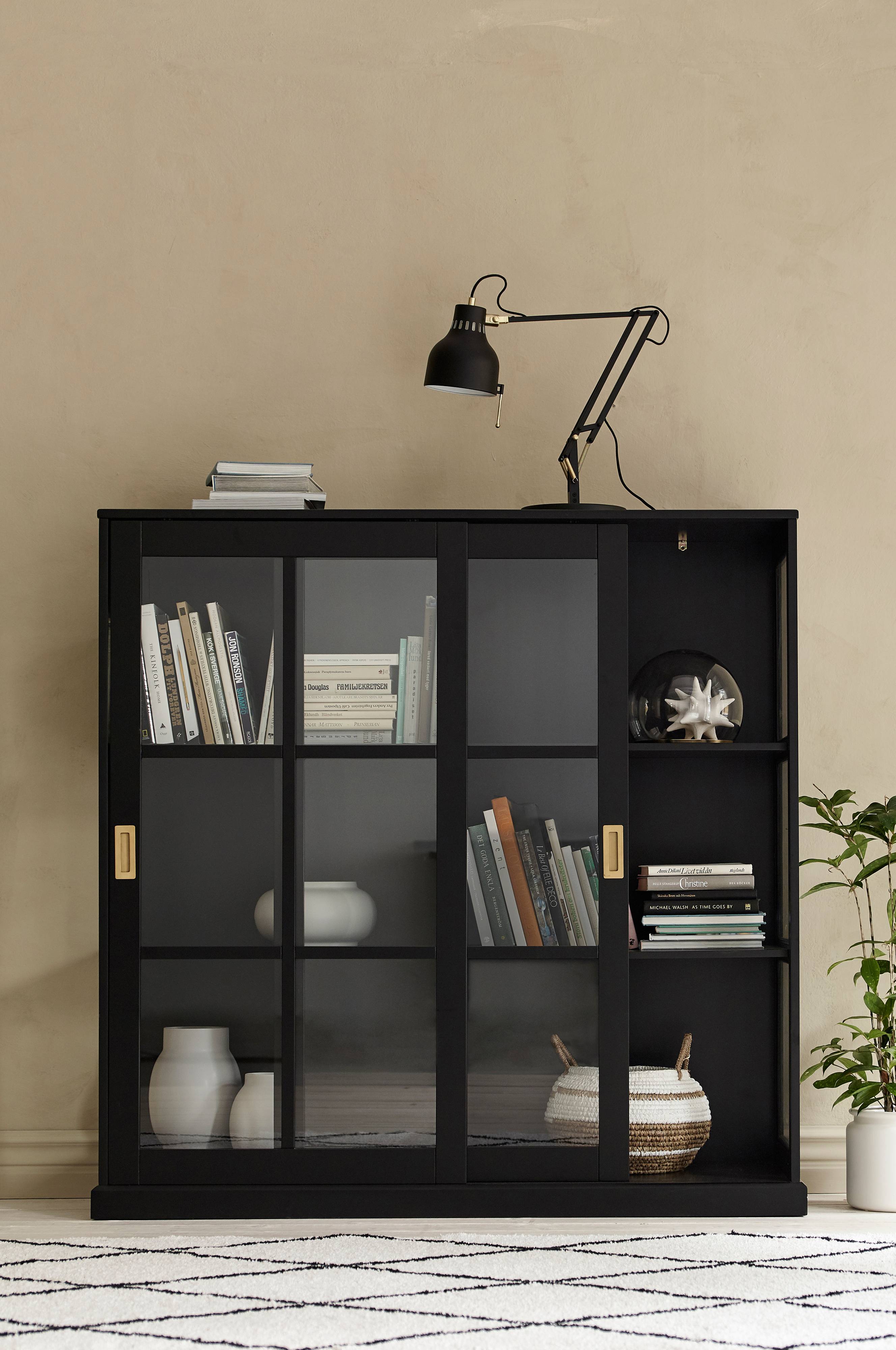 Vankka ja tilava kaappi moneen käyttötarkoitukseen. MDF-levyä, sivut ja liukuovet lasia. Liukuovissa vedin antiikkimessinginväristä metallia. Kaksi kiinteää hyllytasoa ja väliseinä.