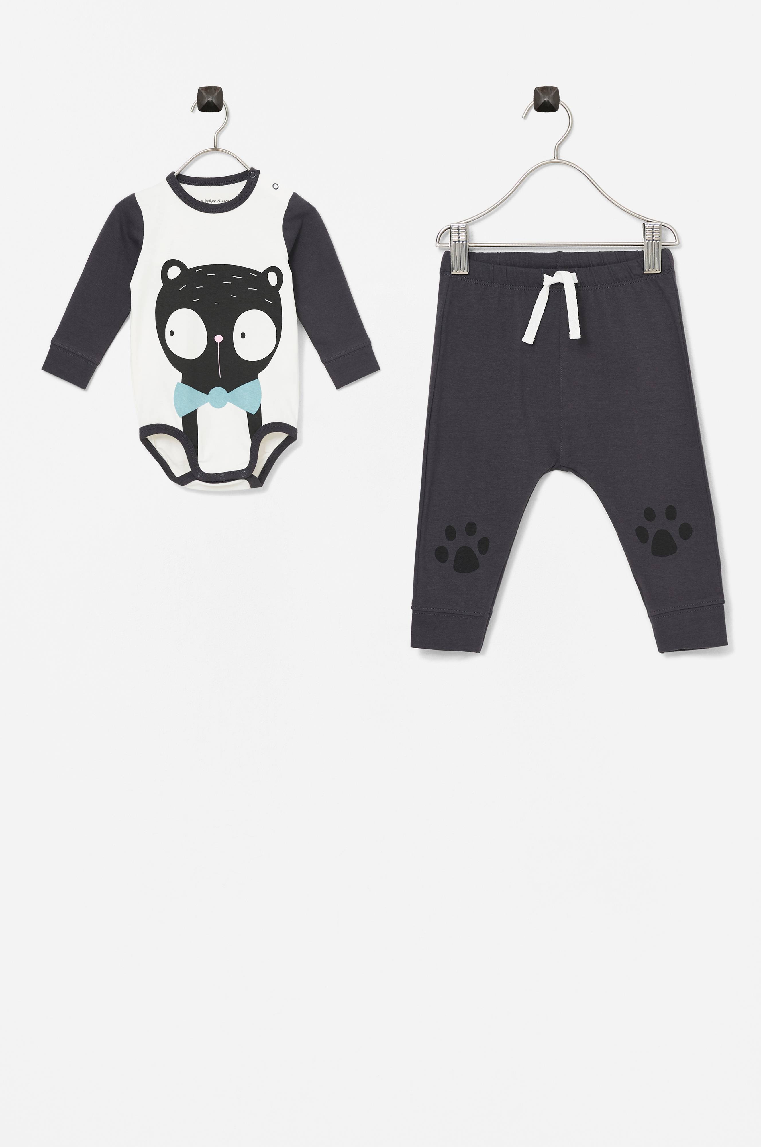 Vauvan setti pehmeää ja joustavaa puuvillatrikoota. Pitkähihainen body, jossa pyöreä pääntie. Painonapit toisella olalla ja haarassa. Housuissa joustava vyötärö, jonka sisäpuolella nyöri, ja lahkeensuissa resori.