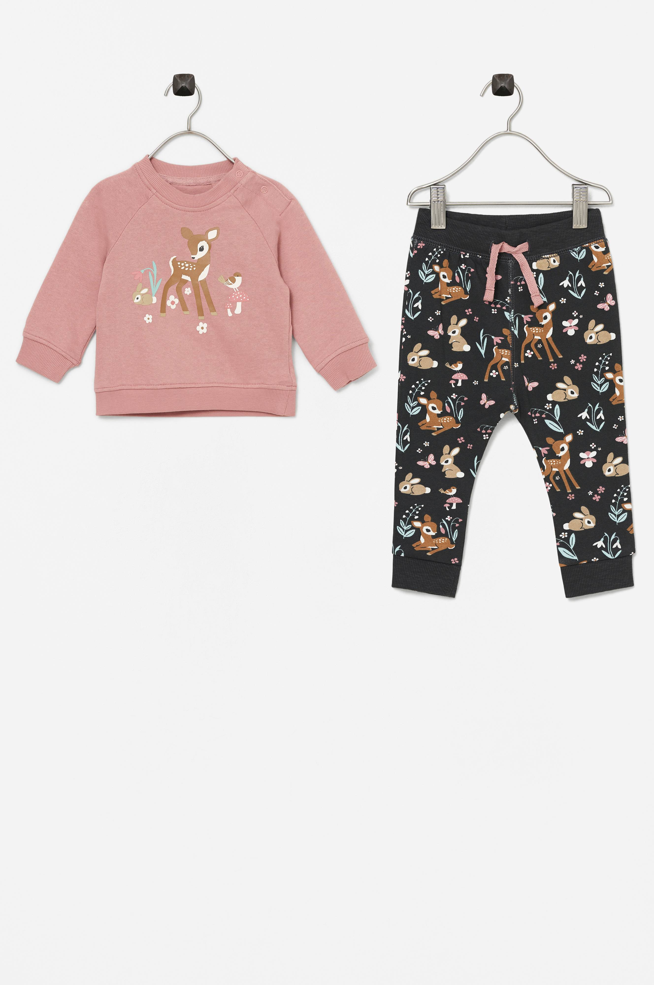 Kaksiosainen setti ekologista puuvillaa. Collegepusero, jossa painatus edessä, raglanhihat ja painonapit toisella olkapäällä. Collegehousut, joissa joustava vyötärö ja nyöri. Resori lahkeensuissa. Pehmeäksi harjattu sisäpinta.