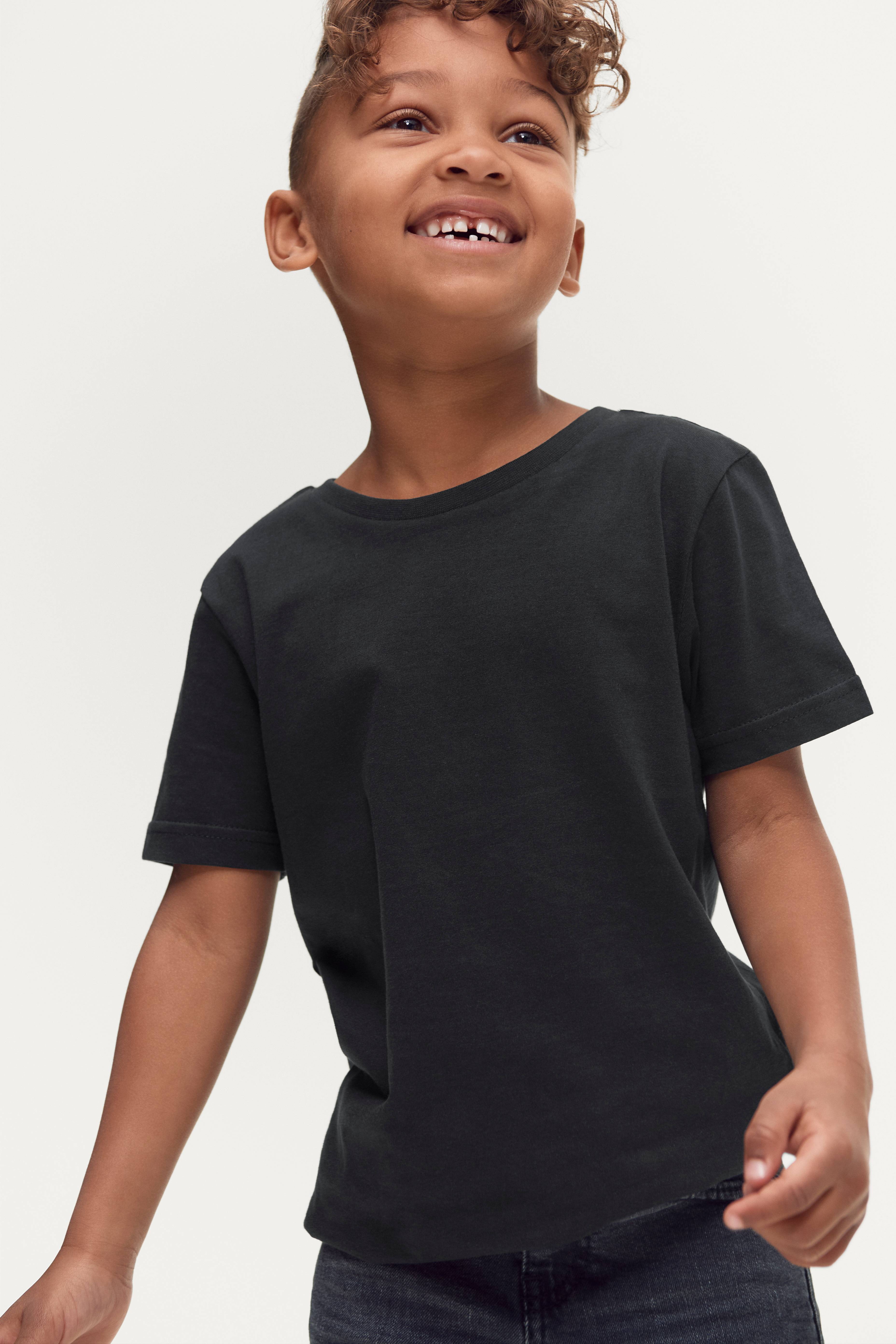 Basic-T-paita pehmeää puuvillatrikoota. Lyhythihainen malli, jossa pyöreä joustinneulospääntie.