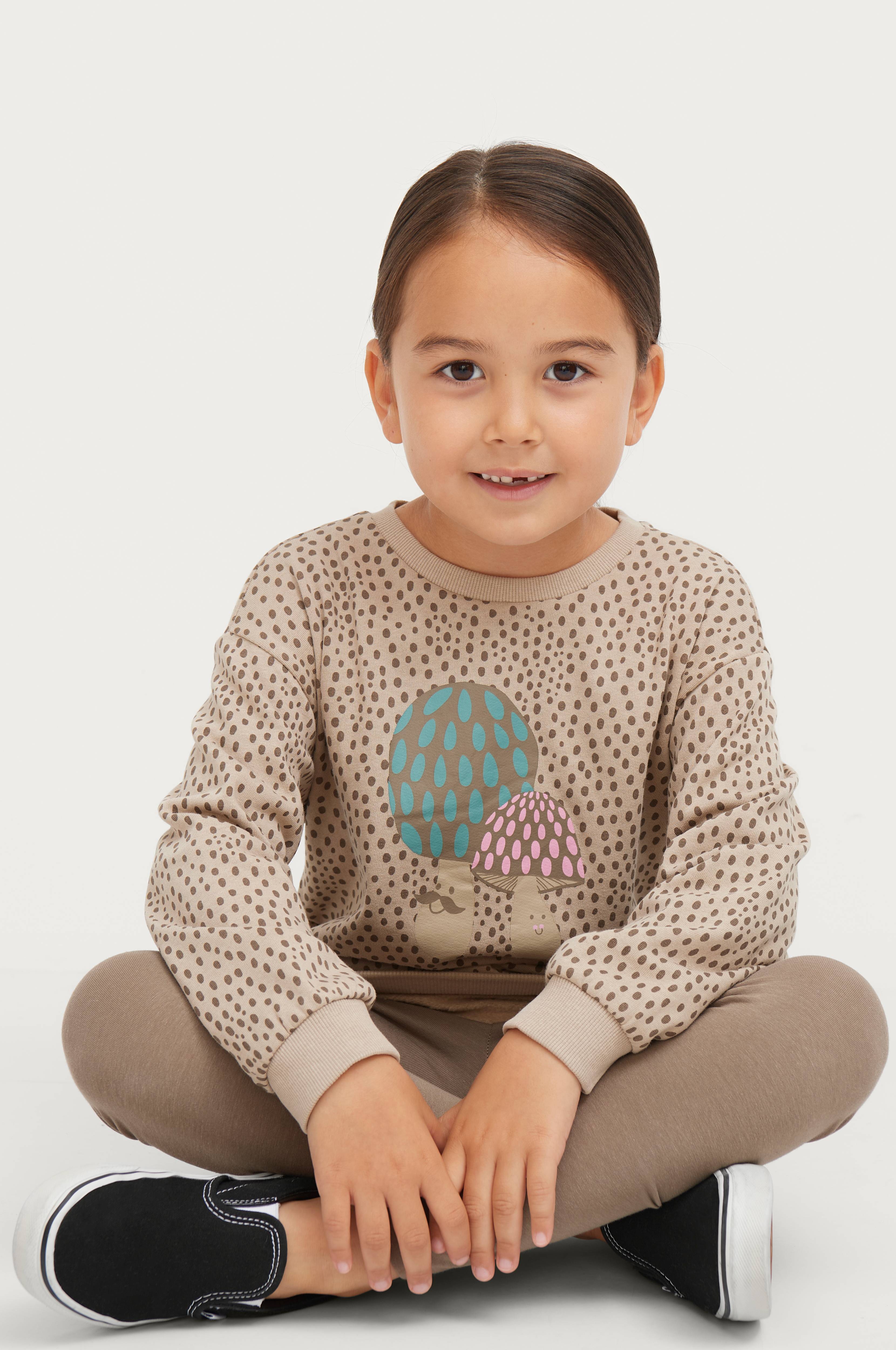 Kaksiosainen setti, jossa leggingsit ja collegepusero. Yksiväriset leggingsit puuvillatrikoota. Pitkähkö kuviollinen collegepusero, jossa resori hihansuissa ja helmassa.