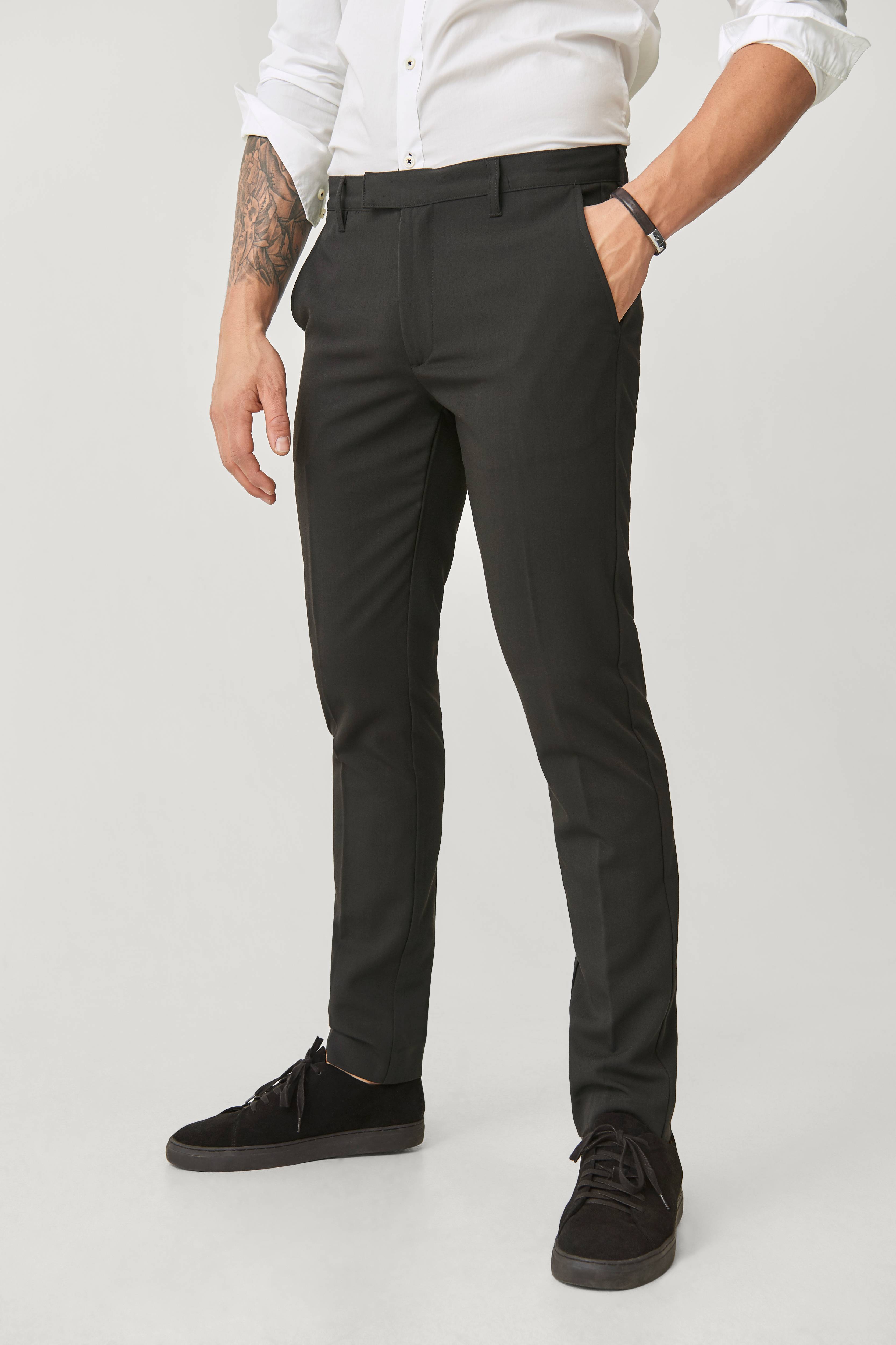 On Our Terms Algot -housut mukavaa stretchmateriaalia. Vyötärönauhassa vyölenkit, hakassuljenta ja nappi. Etuhalkiossa vetoketju. Kaksi etutaskua ja kaksi upotettua takataskua, joissa nappi. Lahkeen sisäpituus n. 81 cm koossa 50.
