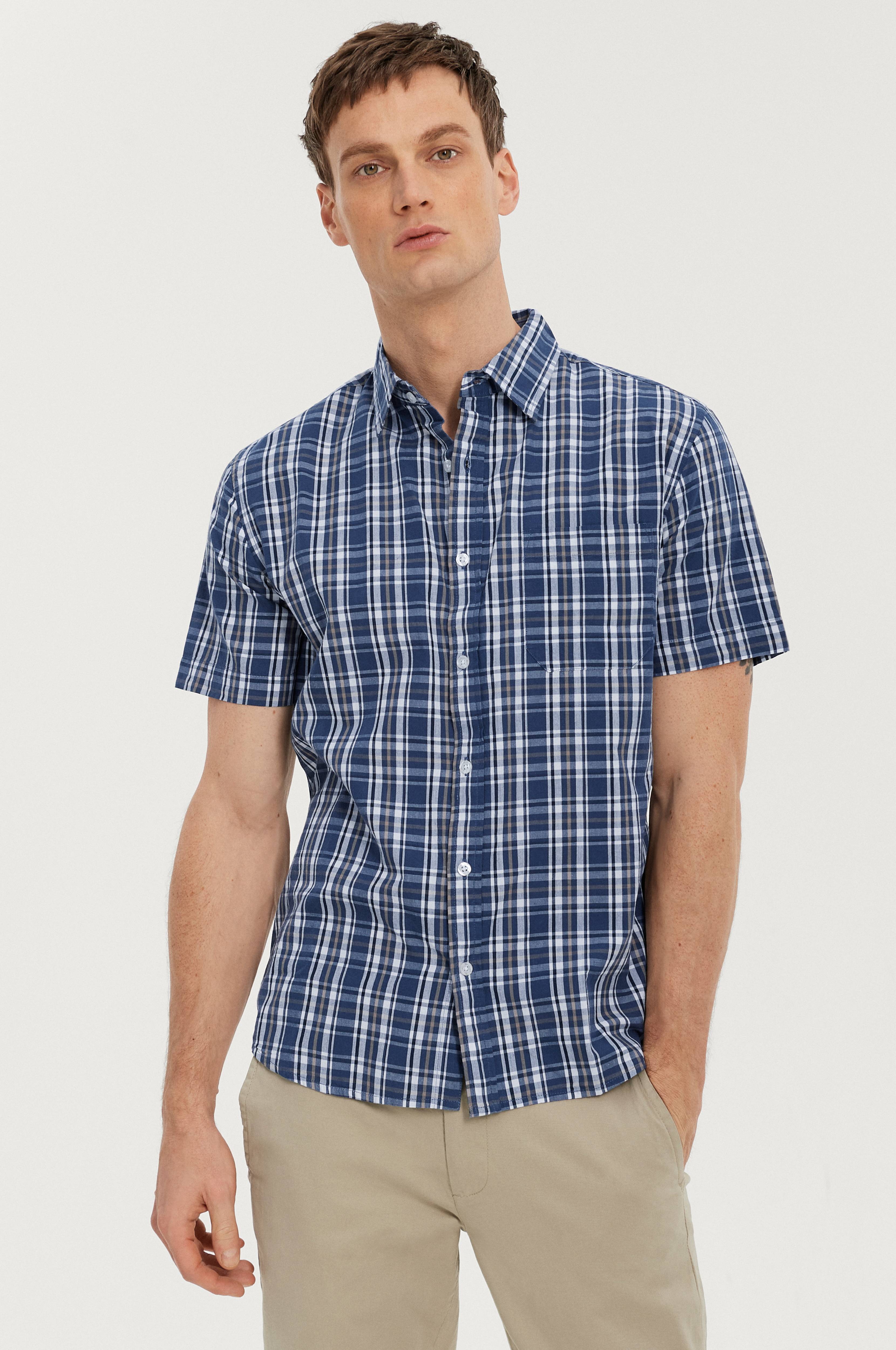 Lyhythihainen, ruutukuvioinen kauluspaita puuvillaa. Päälleommeltu rintatasku ja hieman pyöristetty helma.