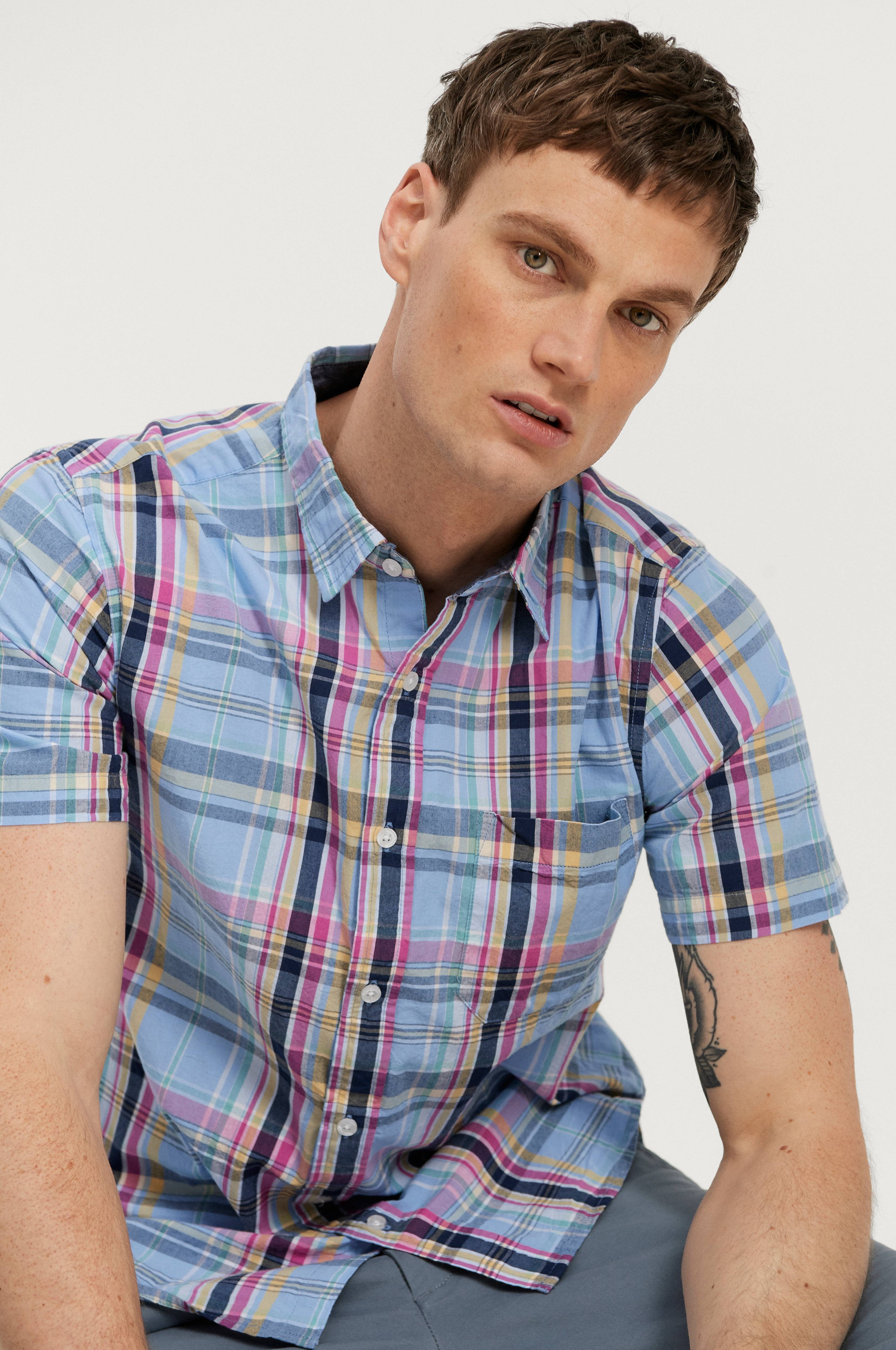 Lyhythihainen, ruutukuvioinen kauluspaita puuvillaa. Päälleommeltu rintatasku ja hieman pyöristetty helma.