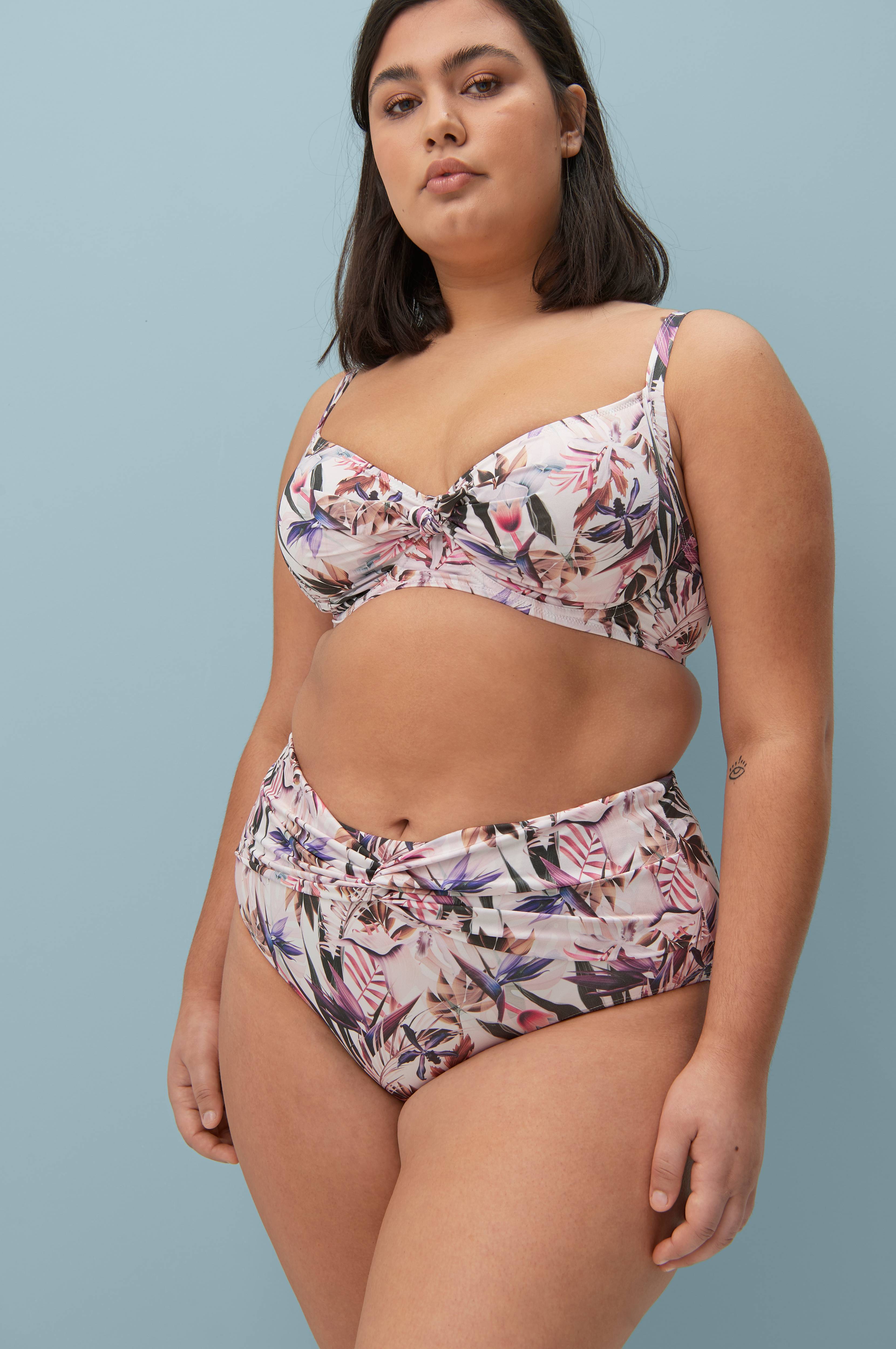 Harley-bikinihousut, joissa korkea vyötärö ja leveät sivut. Edessä vyötäröllä leveä nauha, jossa solmu. Kokovuori.