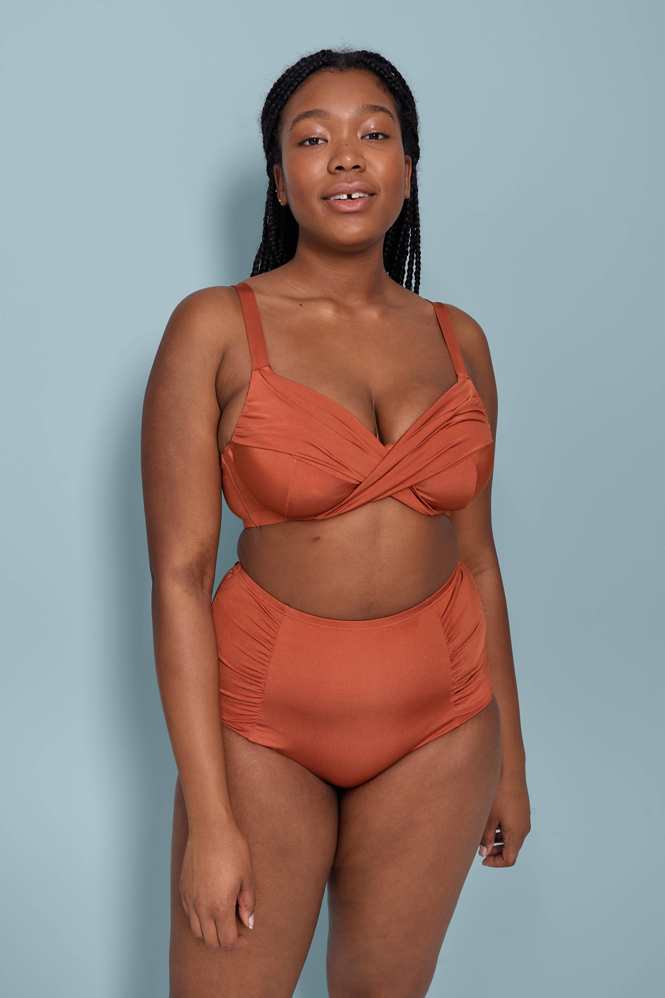 Bikiniyläosa, jossa kaarituet ja ristikkäinen poimutus edessä. Kolmiosaiset kupit, joissa vakaa verkkovuori. Säädettävät, leveähköt olkaimet ja metallisolki selässä.
