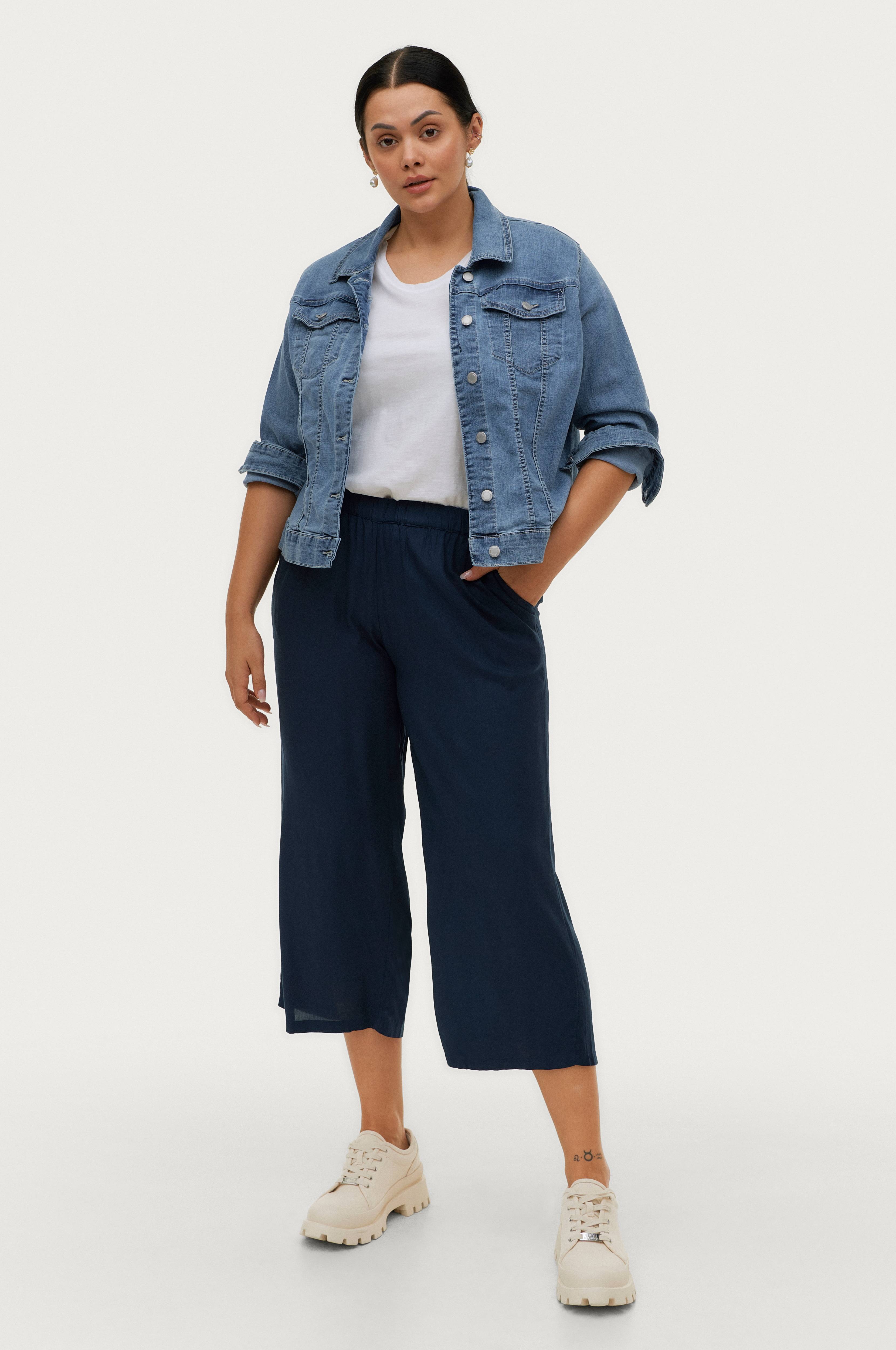 Caprimalliset housut, joissa suorat ja leveät lahkeet. Pehmeää ja viileän tuntuista viskoosia. Kuminauha vyötäröllä. Sivutaskut. Lahkeen sisäpituus n. 59 cm koossa 42/44.