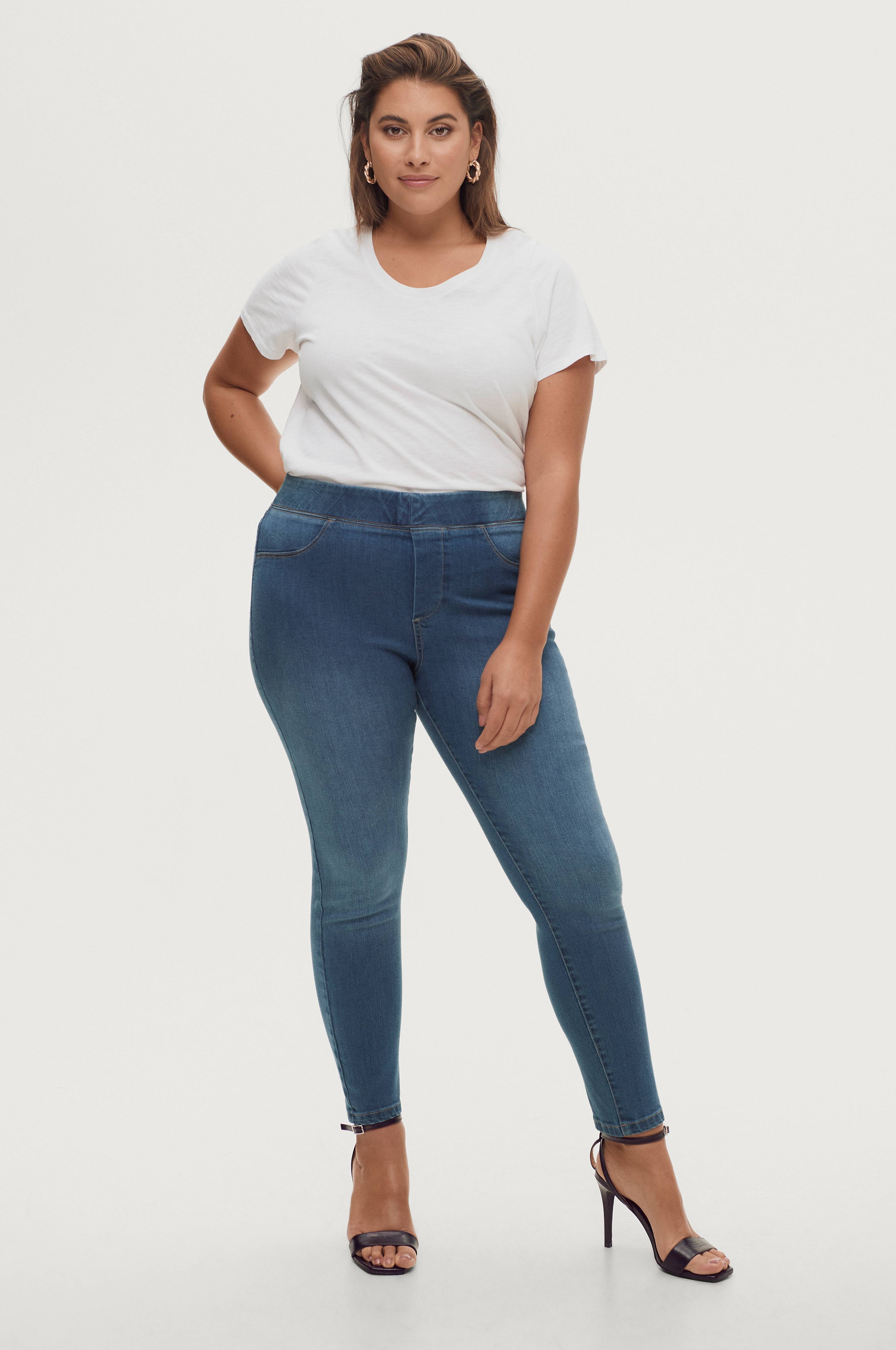 Lottie-farkut stretchdenimiä. Miellyttävä malli, jossa leveä kuminauha vyötärön sisäpuolella. Koristetikatut vale-etutaskut ja kaksi päälleommeltua takataskua. Kapea istuvuus ja korkea vyötärö. Lahkeen sisäpituus n. 78 cm joka koossa.