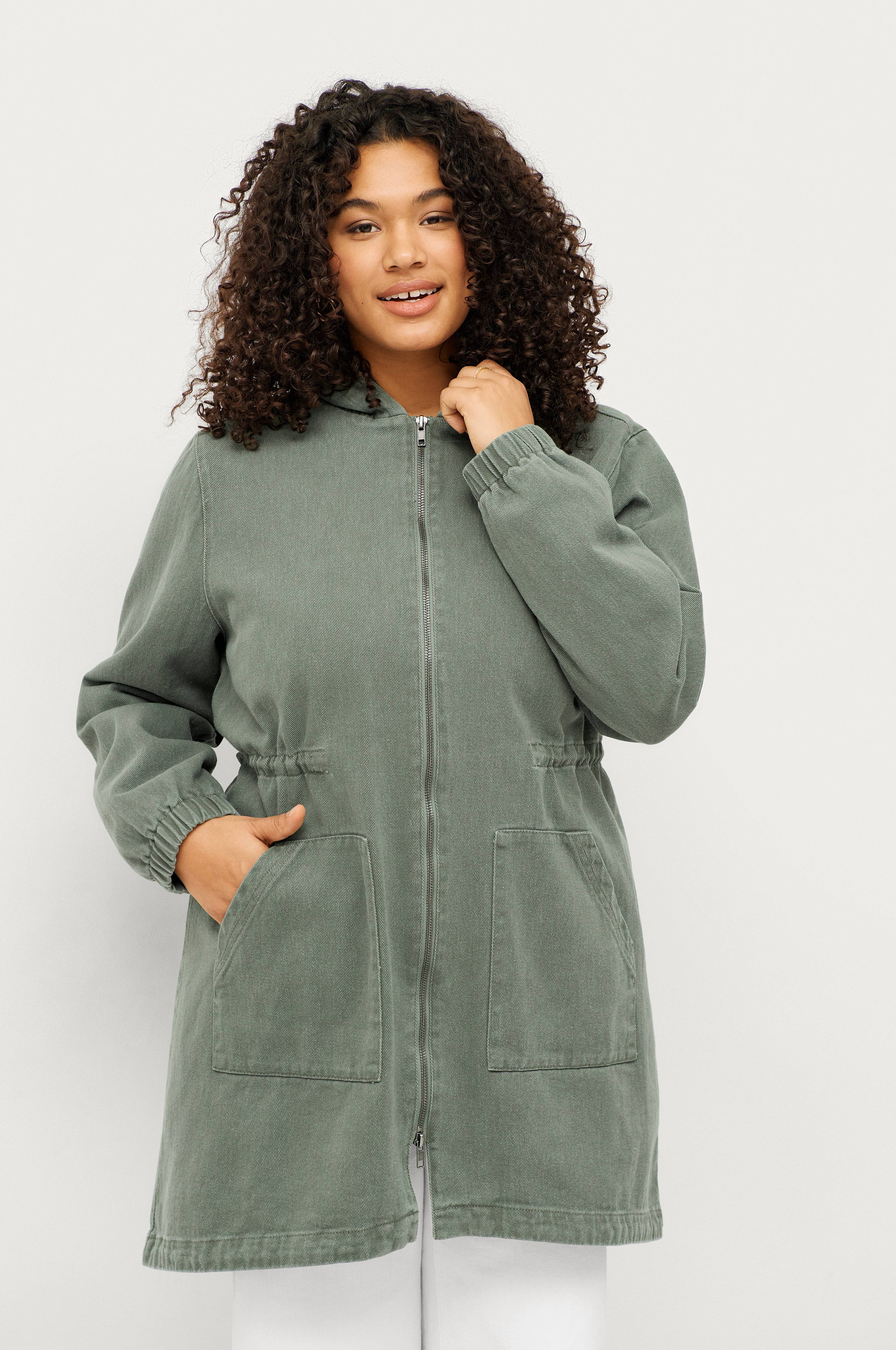 Ellos Plus Collection on puhdasta laatua ja kestävästi tuotettuja vaatteita. Hyvää istuvuutta ja käyttömukavuutta mielessä pitäen suunnitellut vaatekappaleet on luotu etenkin naisille, jotka käyttävät kokoja 44-60. • Pitkä farkkutakki säädettävällä vyötäröllä
