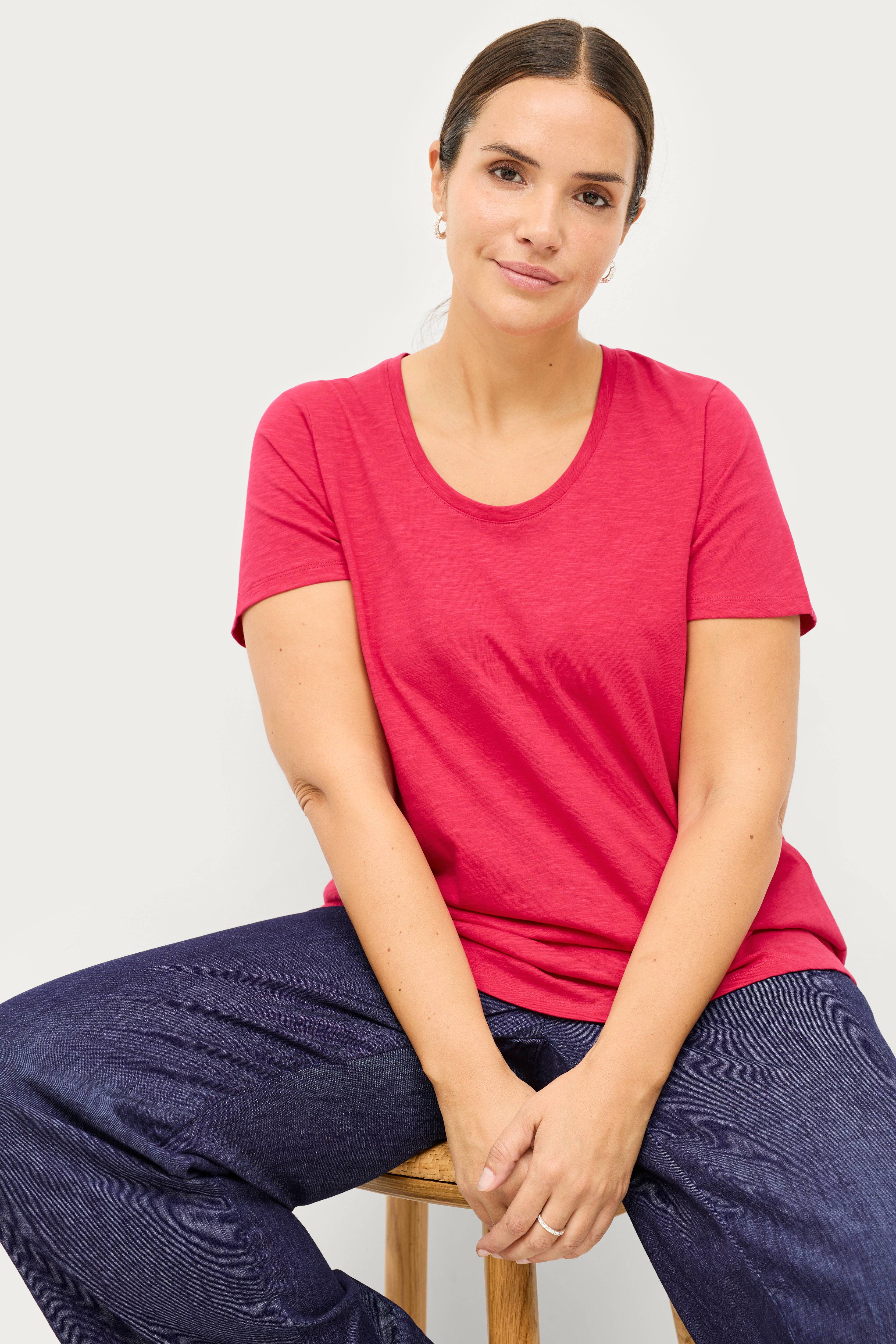 Lyhythihainen Kat-trikoopusero pehmeää, hieman eläväpintaista puuvillaa. Pyöreä pääntie, jossa kapeavakoinen reuna. Pituus n. 76 cm koossa 46/48.