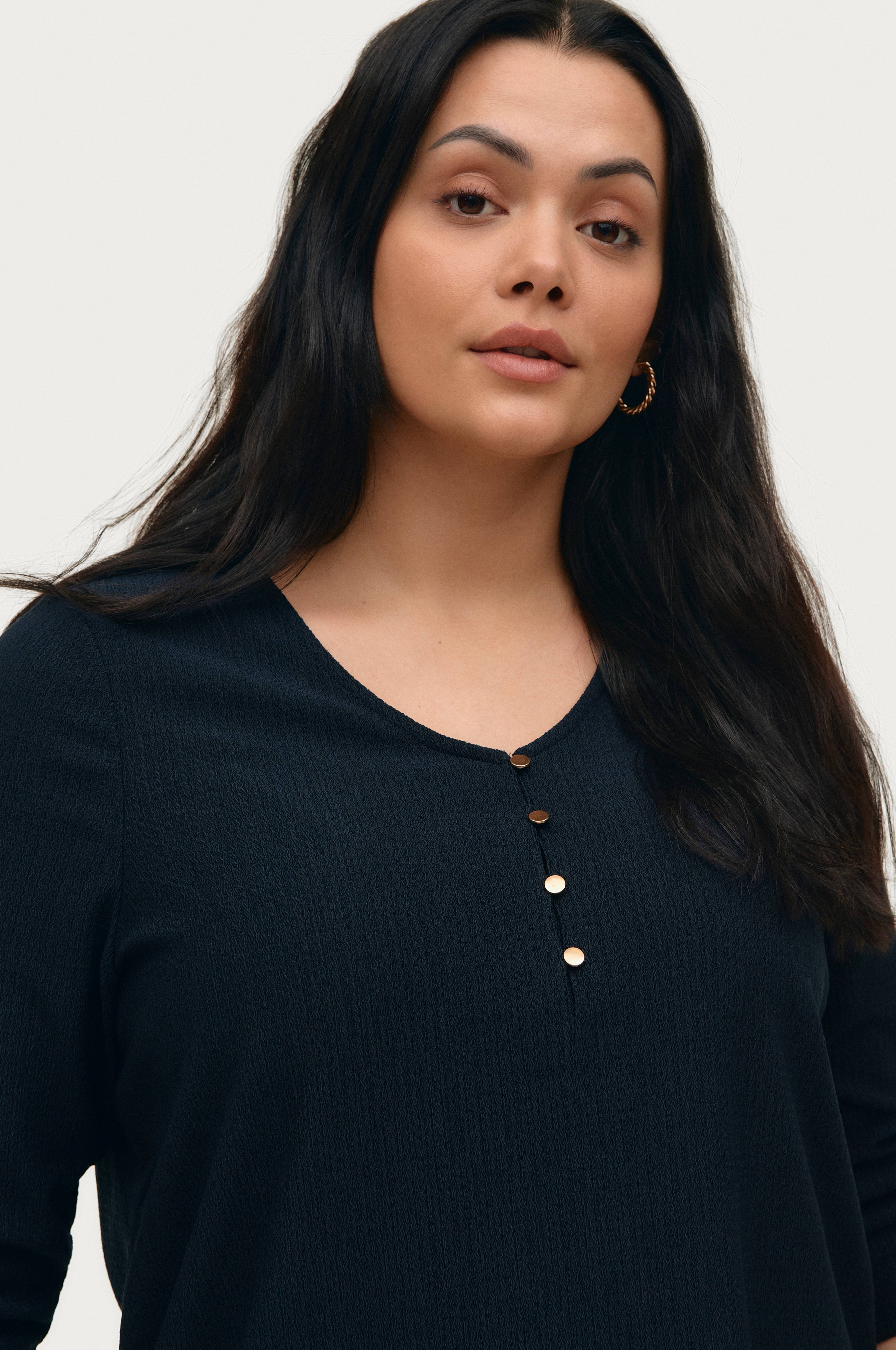 Pusero ihanaa, pehmeää ja joustavaa materiaalia, jossa kaunis pintakuvio. Levenevä malli ja 3/4-pituiset hihat. V-pääntie, jossa neljä kullanväristä metallinappia edessä. Pituus n. 80 cm koossa 46/48.