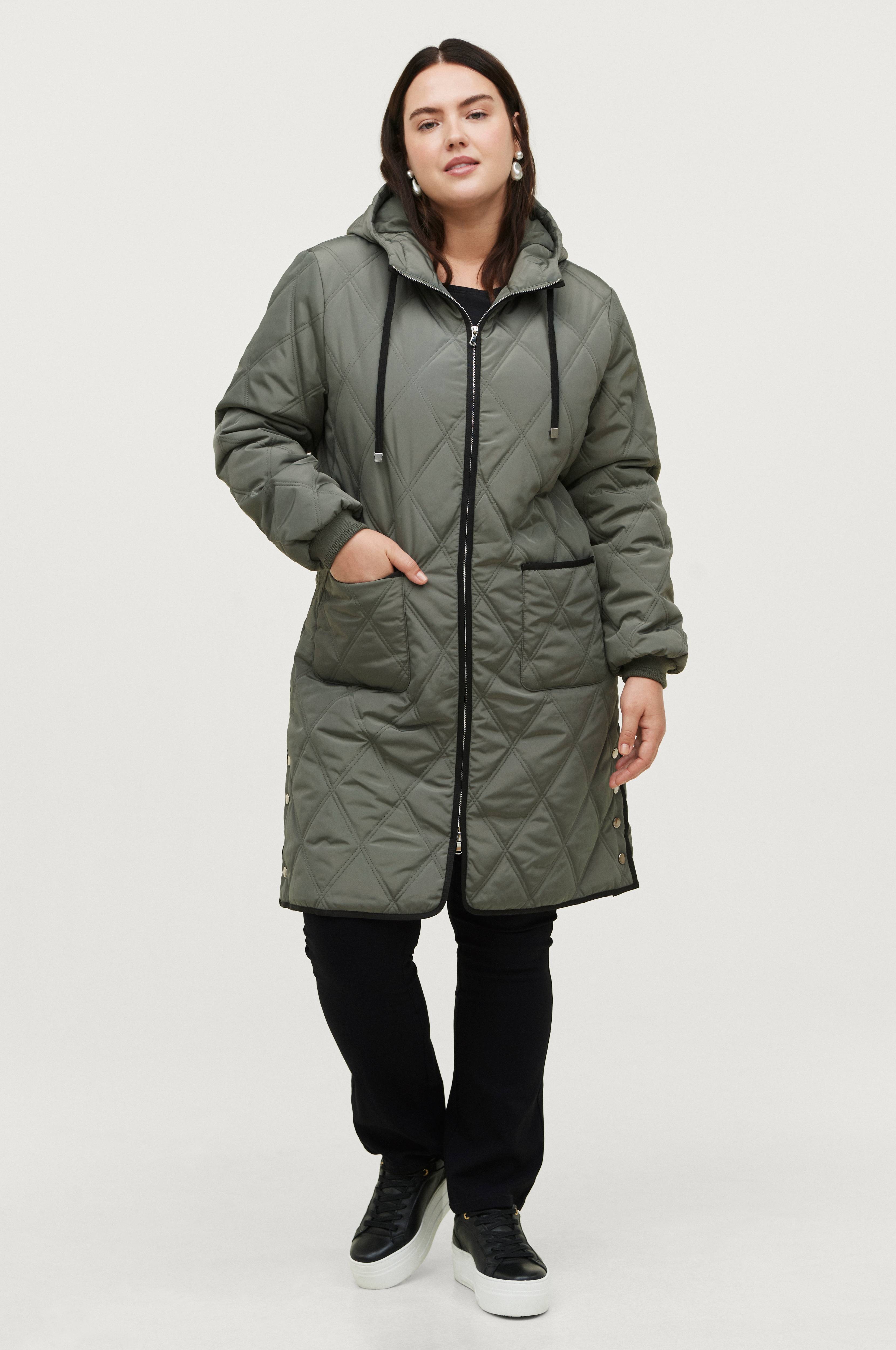 Ruututikattu ja topattu takki, jossa hieman kiiltävä päällyskangas. Sileä kangasvuori. Kiinteä huppu, jossa nyöri. Takki suljetaan kaksisuuntaisella vetoketjulla. Kaksi päälleommeltua taskua. Resorihihansuissa ja helmassa painonapilliset sivuhalkiot. Pituus n. 100 cm koossa 42/44.