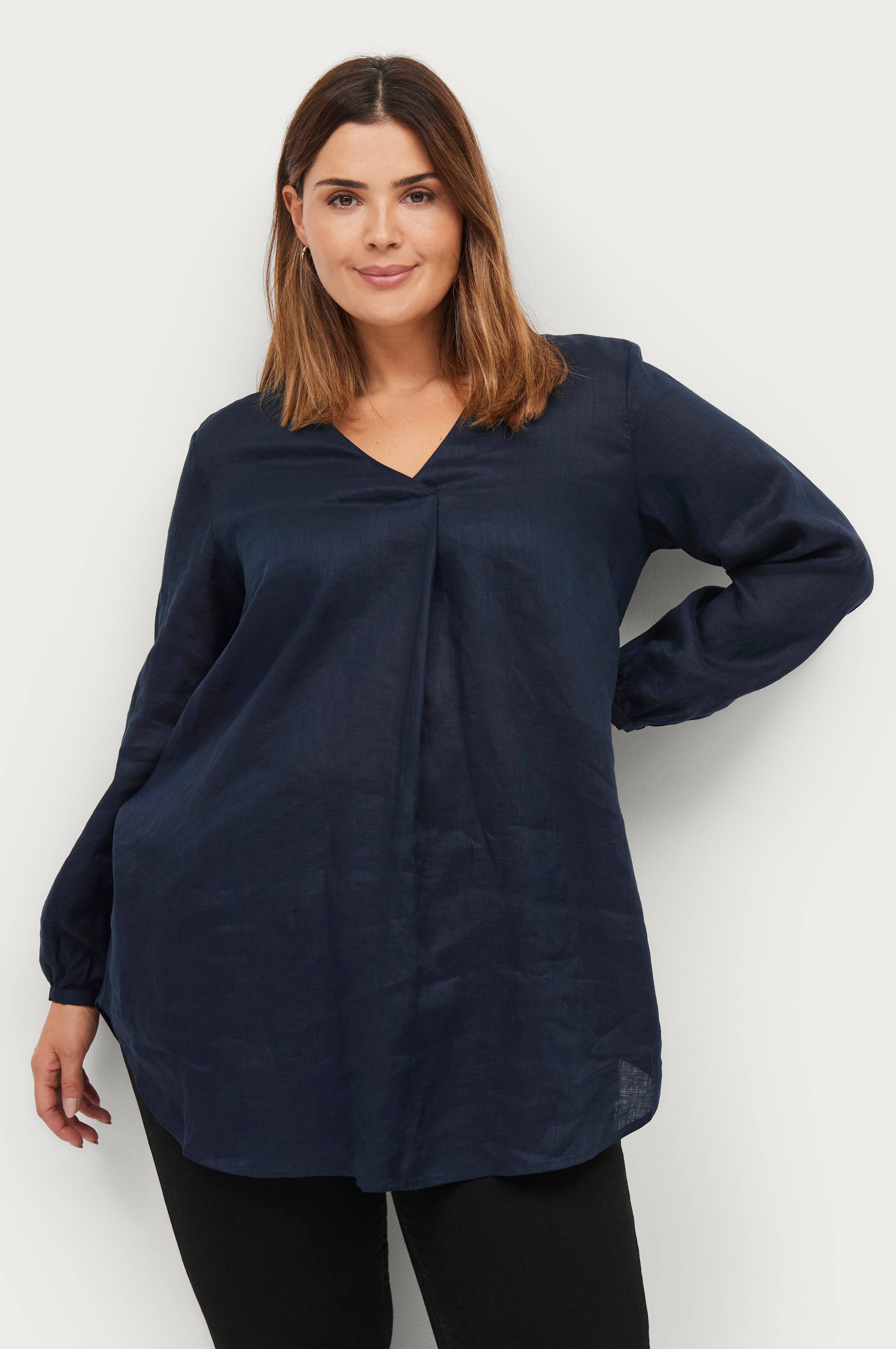 - Tunika pellavaa - A-linjainen malli - Edessä V-pääntie ja laskos - Pitkät hihat, joissa kapea kalvosin - Pyöristetty helma - Pituus: 88 cm koossa 46/48