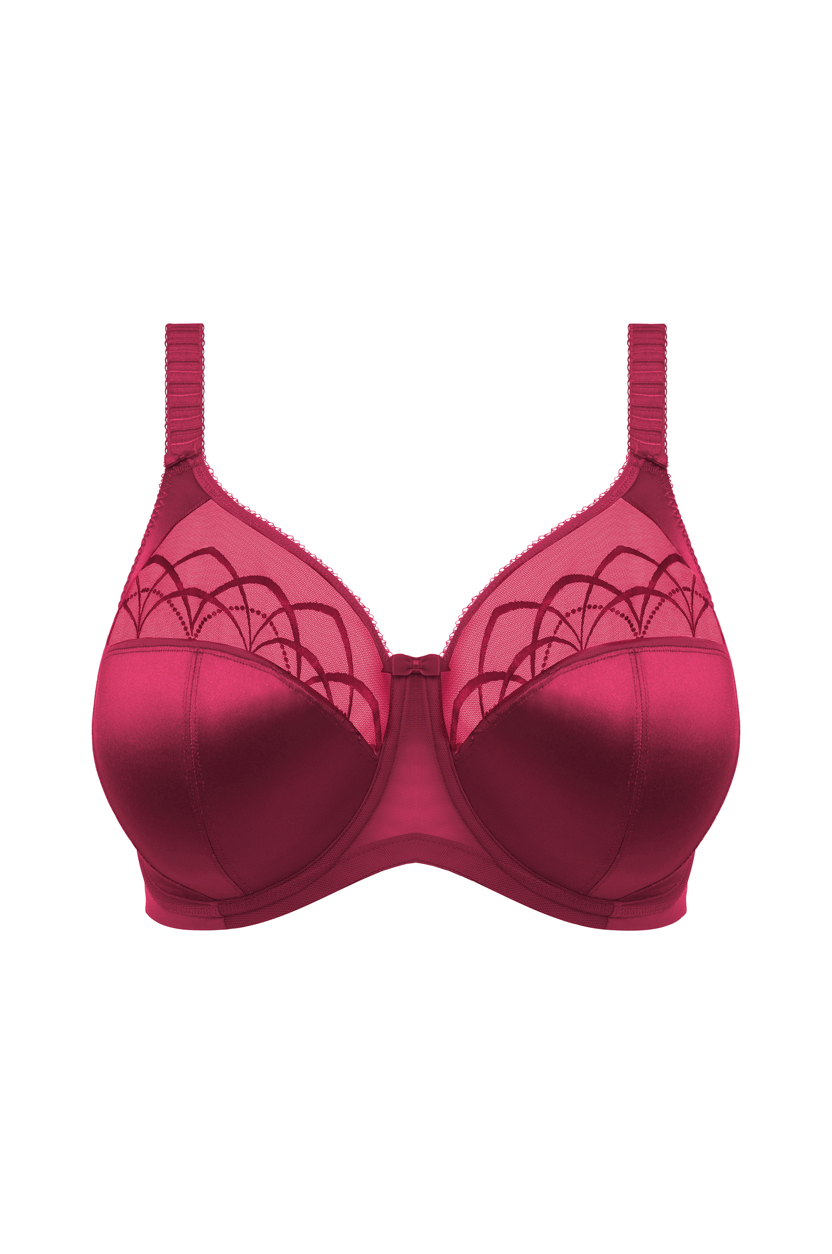 Elomi Full Cup Cate -rintaliivit kiiltävää materiaalia, kuppien yläosassa pitsiä. Kaarituet. Pehmeä kuminauha kädenteissä erinomainen istuvuus. Sievää pykäpitsiä yläreunassa ja olkaimissa, joissa myös raidallista jakardikuosia.