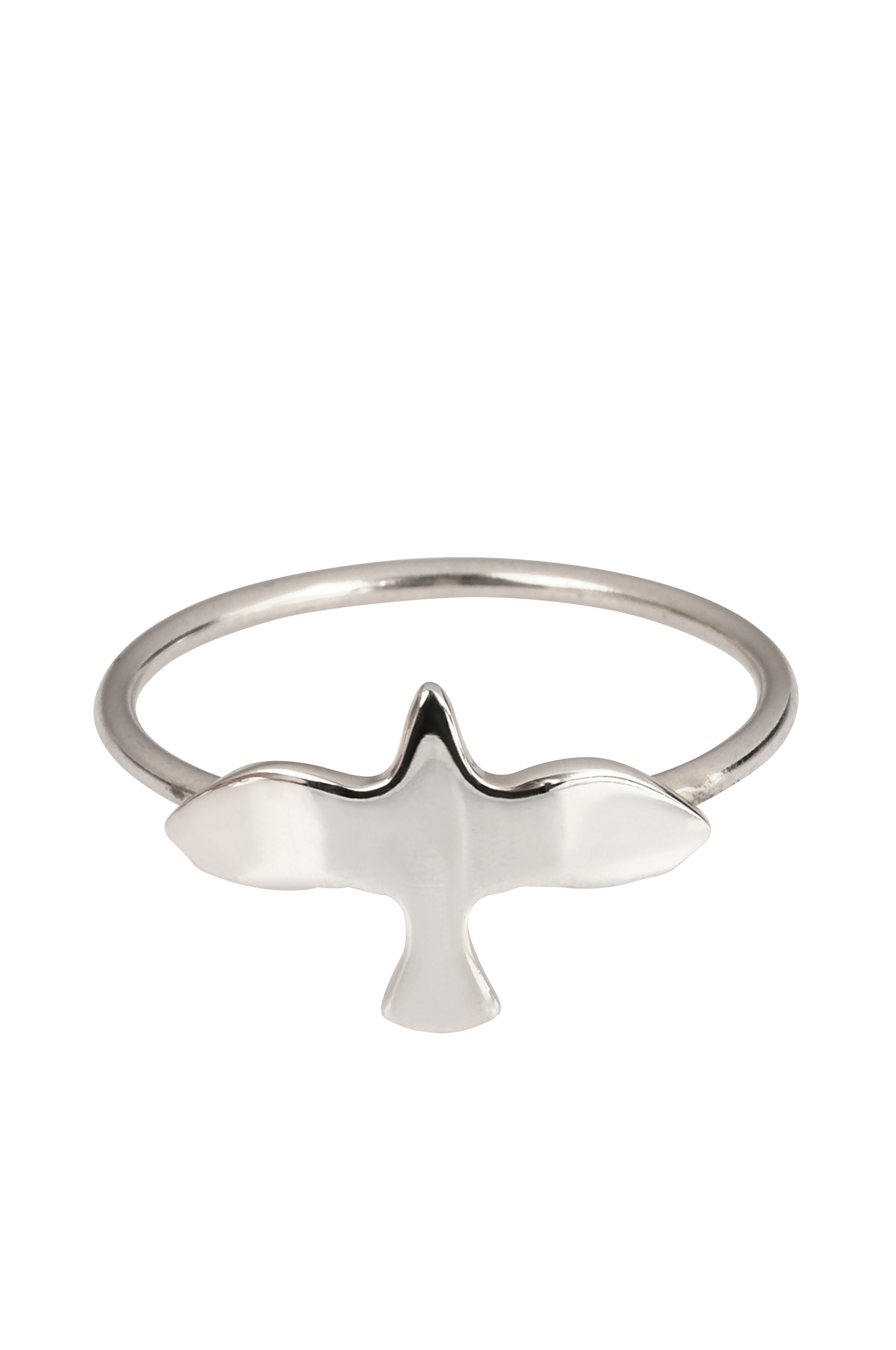 Emma Israelsson Dove -sormus, jossa pieni kyyhky. Materiaali: 18 K:n kullattua messinkiä tai hopeaa. Kyyhkyn mitat: 15 x 10 cm.