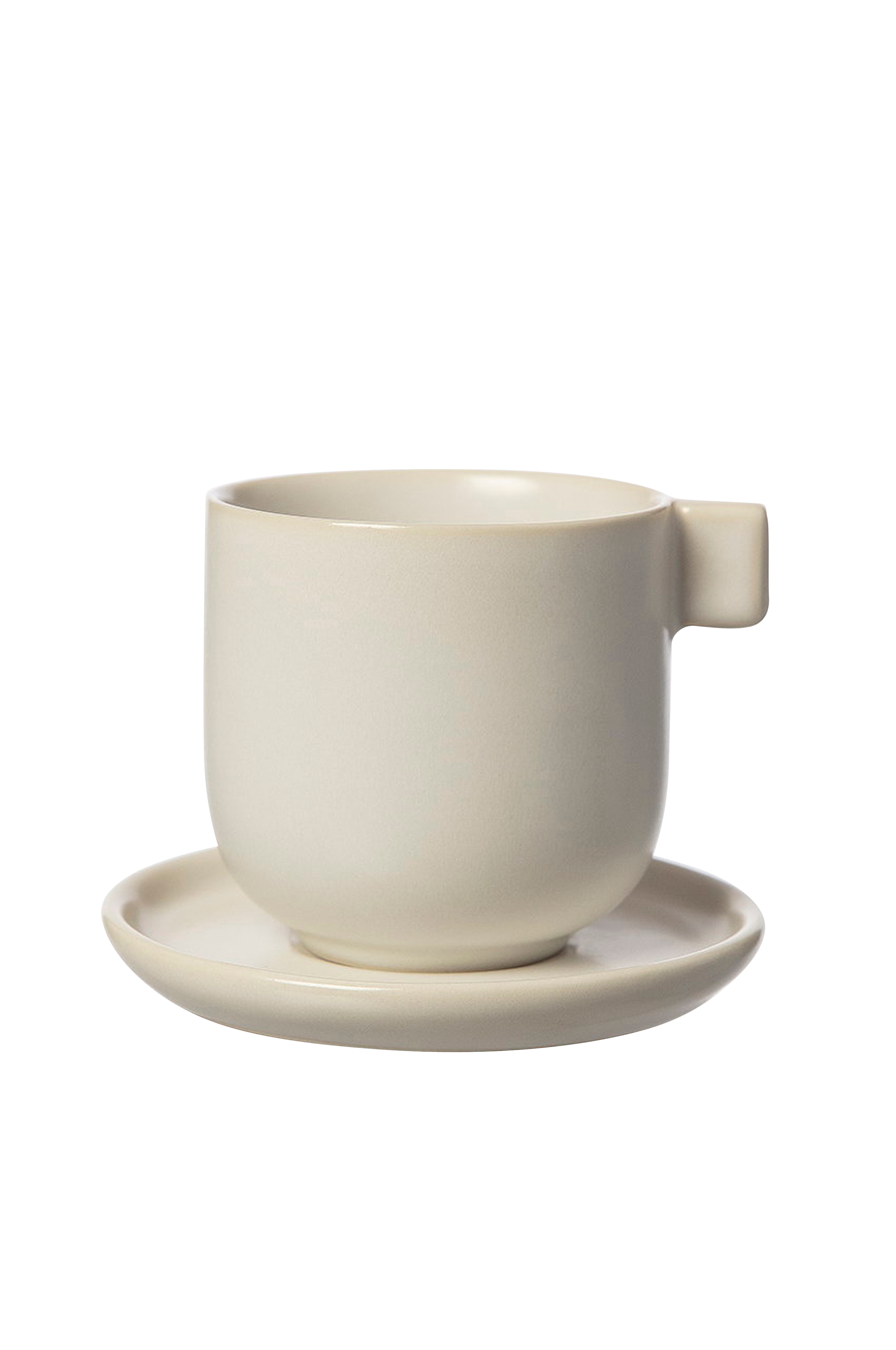 Lasitettu ERNST-kahvikuppi ja aluslautanen kivitavaraa. Saatavana myös mustana sekä teekuppina.