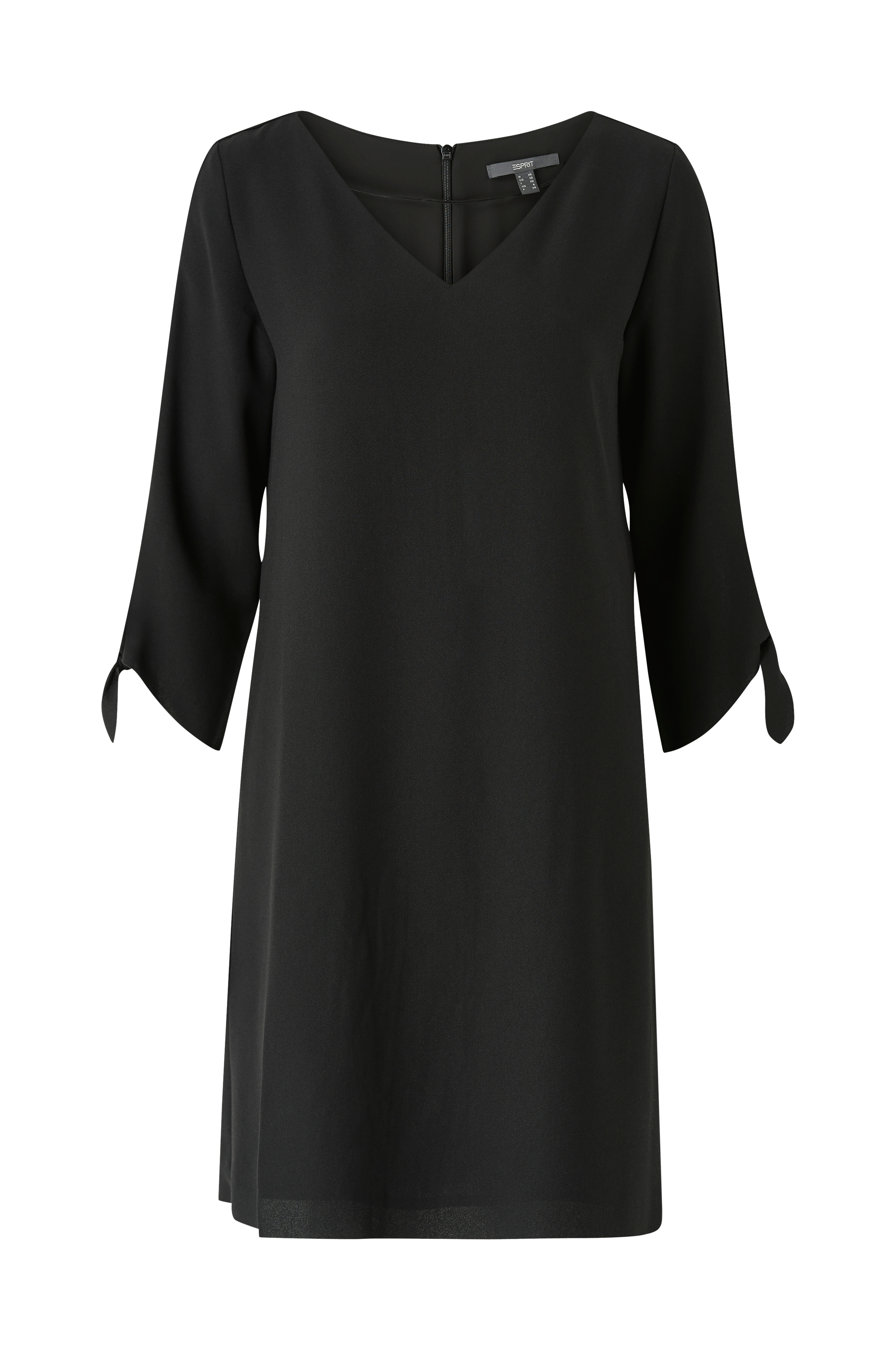 Esprit-mekko. Hieman levenevä malli kreppimateriaalia. V-pääntie, jossa piilovetoketju selässä. 3/4-pituiset hihat, joissa halkio ja solmittavat nauhat hihansuissa. Huomaamattomat, päärmäämättömät reunat. Pituus n. 95 cm koossa S.