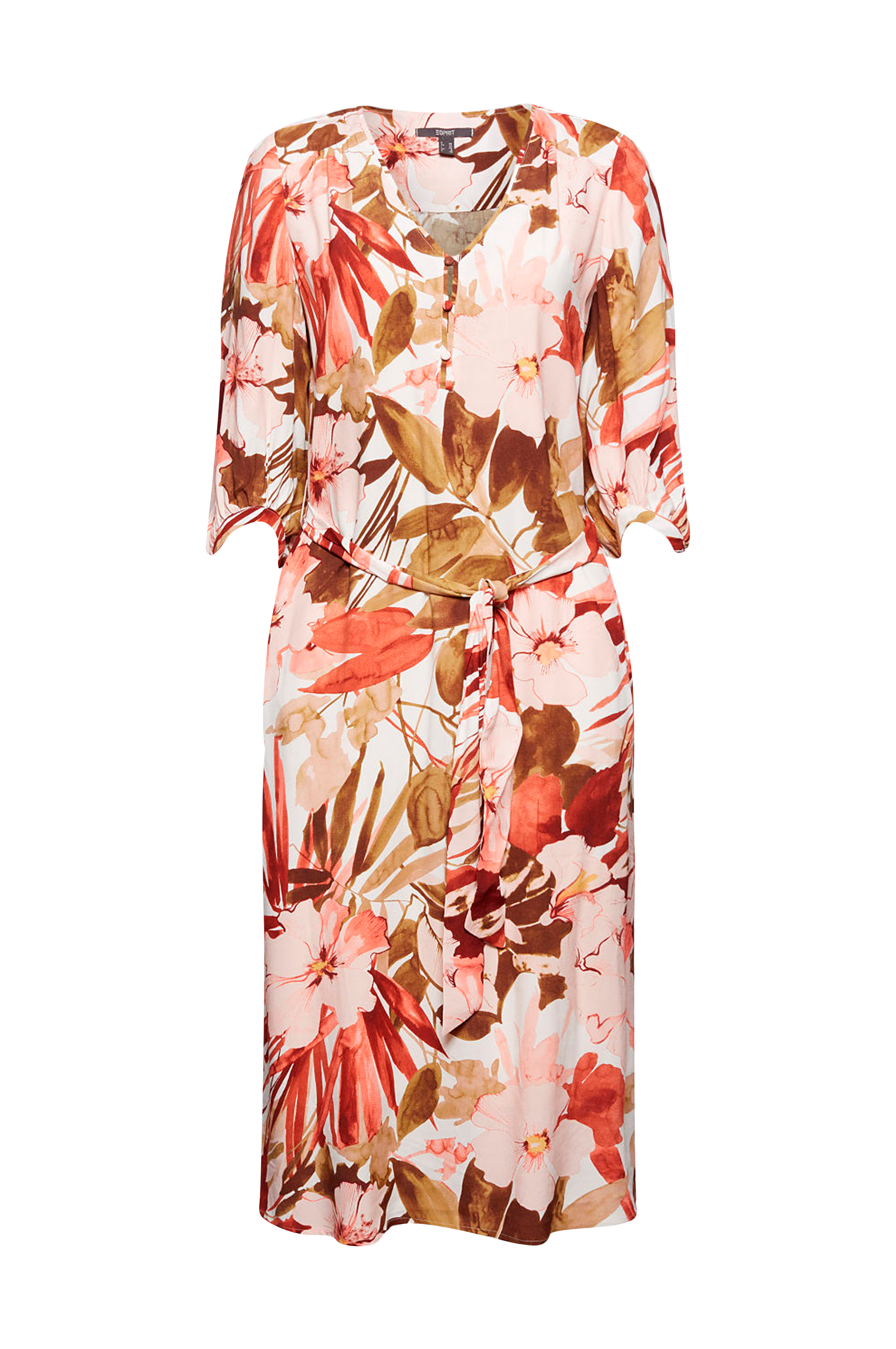 Levenevä mekko pehmeästi laskeutuvaa materiaalia. Olkakaarroke, jossa poimutukset edessä ja takana. V-pääntiessä kapea reunus ja edessä lyhyt nappilista päällystetyin napein. 3/4-pituiset hihat, joissa kapea päälleommeltu reuna hihansuissa. Upotetut sivutaskut. Kapea solmimisvyö vyötäröllä. Pituus n. 118 cm koossa S.