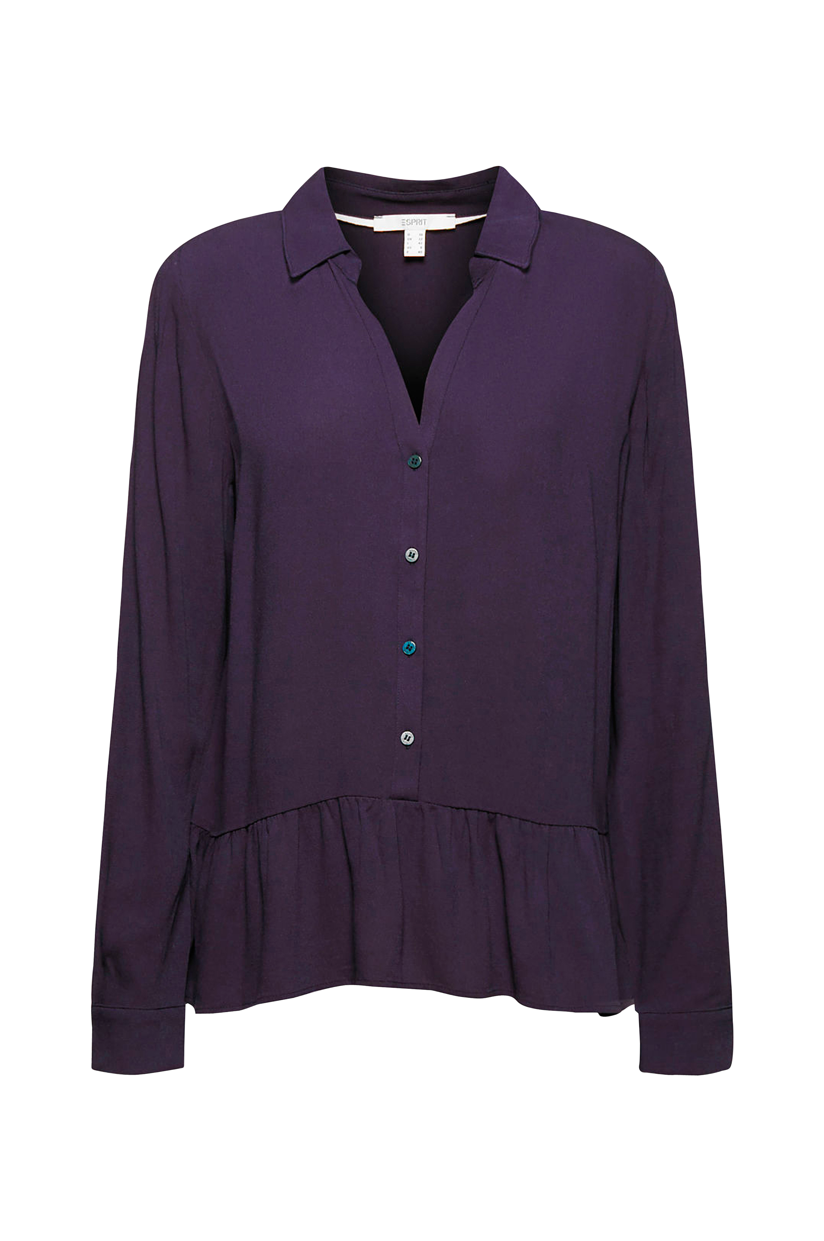 Pehmeästi laskeutuva viskoosipaita. Suora, rento malli. Paidankaulus, V-pääntie ja neljä nappia edessä. Röyhelö helmassa. Napilliset kalvosimet.