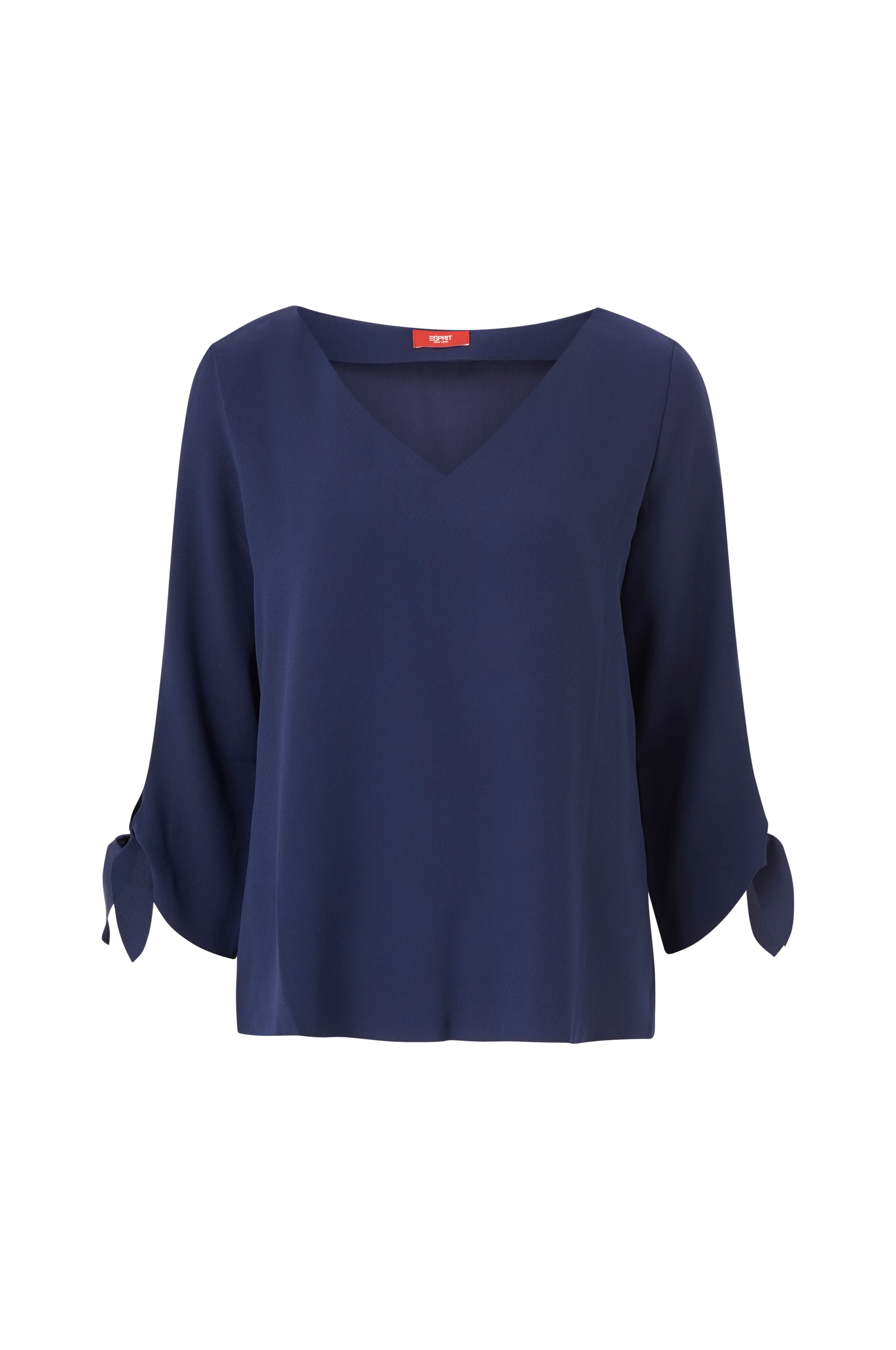 Esprit-paita. Suora malli, jossa V-pääntie ja 3/4-pituiset hihat. Hihansuissa halkio ja solmittavat nauhat. Huomaamattomat, päärmäämättömät reunat.